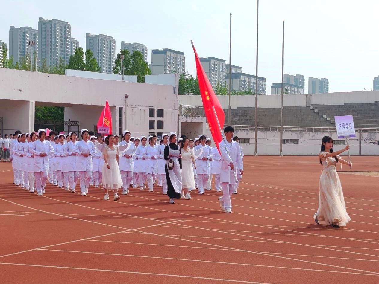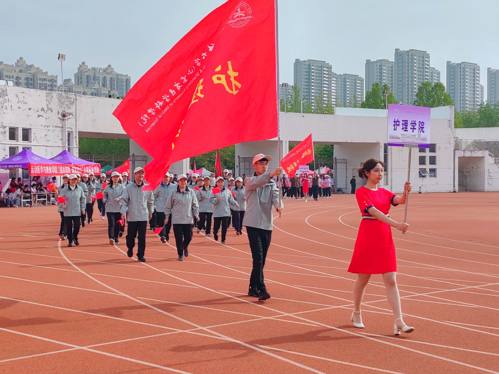 运动员进行曲高亢激扬,催人奋进。晨光熹微,蓝鲸体育的教工和员工方队精神抖擞,整装待发。在激昂的音乐声中,意气风发、踌躇满志的护理师生们伴随着观众的欢呼与喝彩声,踏着稳健的步伐列队向主席台前行,展示着护理师生奋楫赶超的高昂斗志与阳光自信的青春活力。