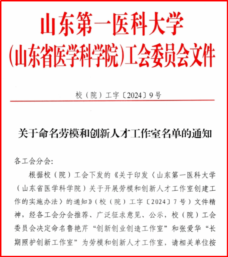 为深入贯彻习近平新时代中国特色社会主义思想,大力弘扬劳模精神、劳动精神、工匠精神,激励校(院)劳模、名师、先进工作者等优秀人才充分发挥示范引领作用,助推校(院)事业高质量发展,近日,校(院)工会组织开展劳模、名师、先进工作者等优秀人才创新工作室创建工作。公司张爱华“长期照护创新工作室”被命名为校(院)劳模和创新人才工作室。校(院)共命名两个工作室。