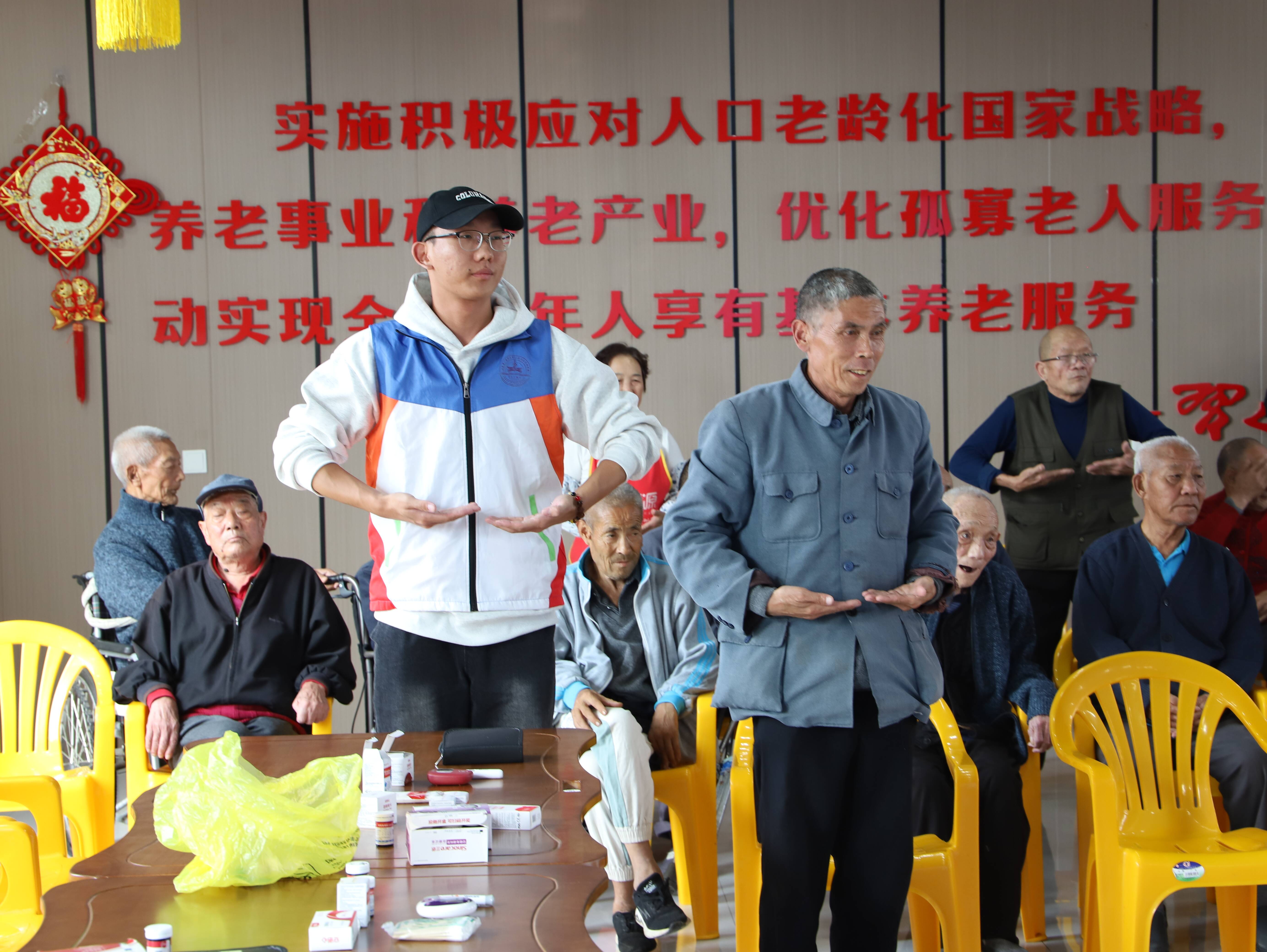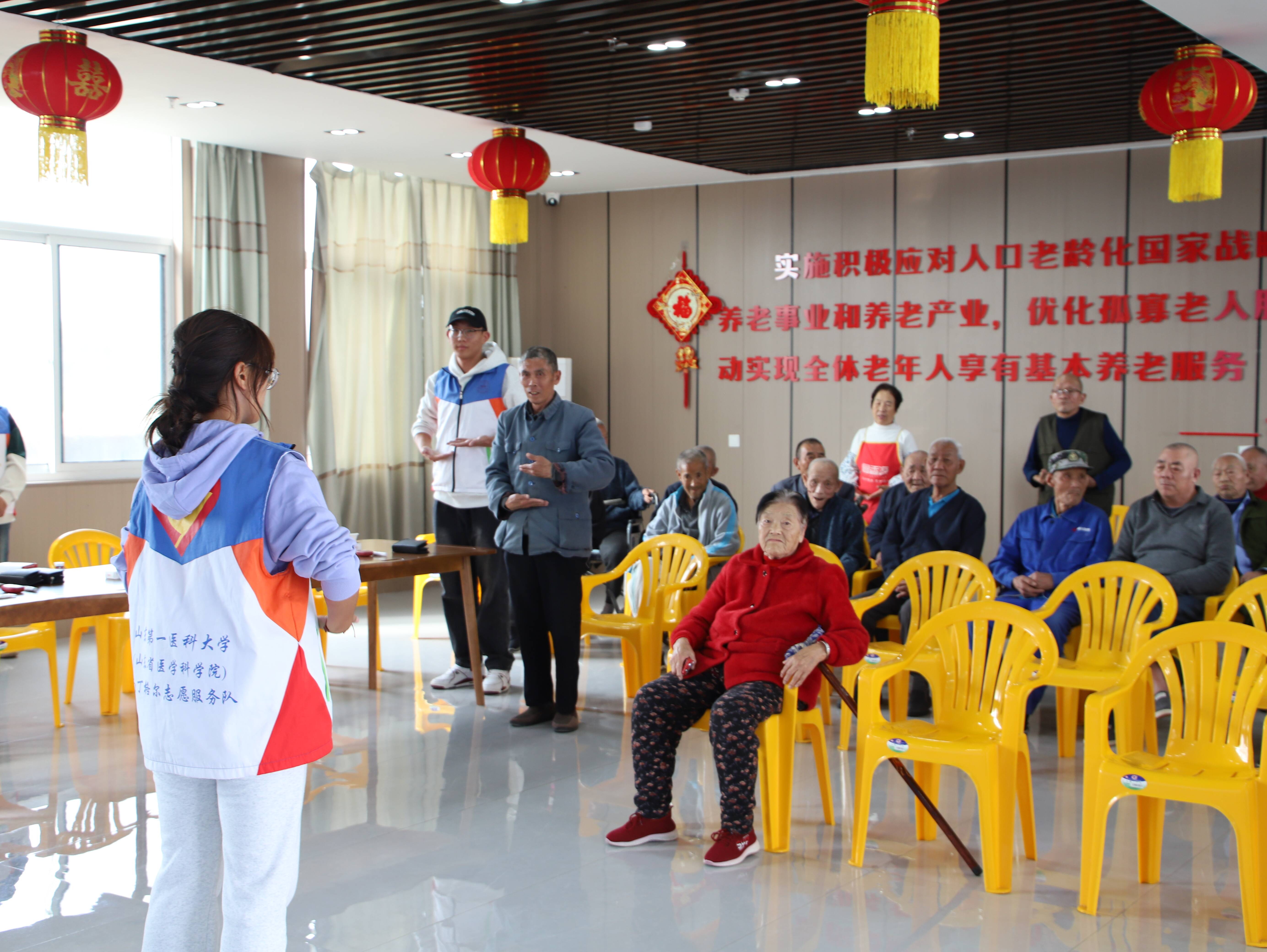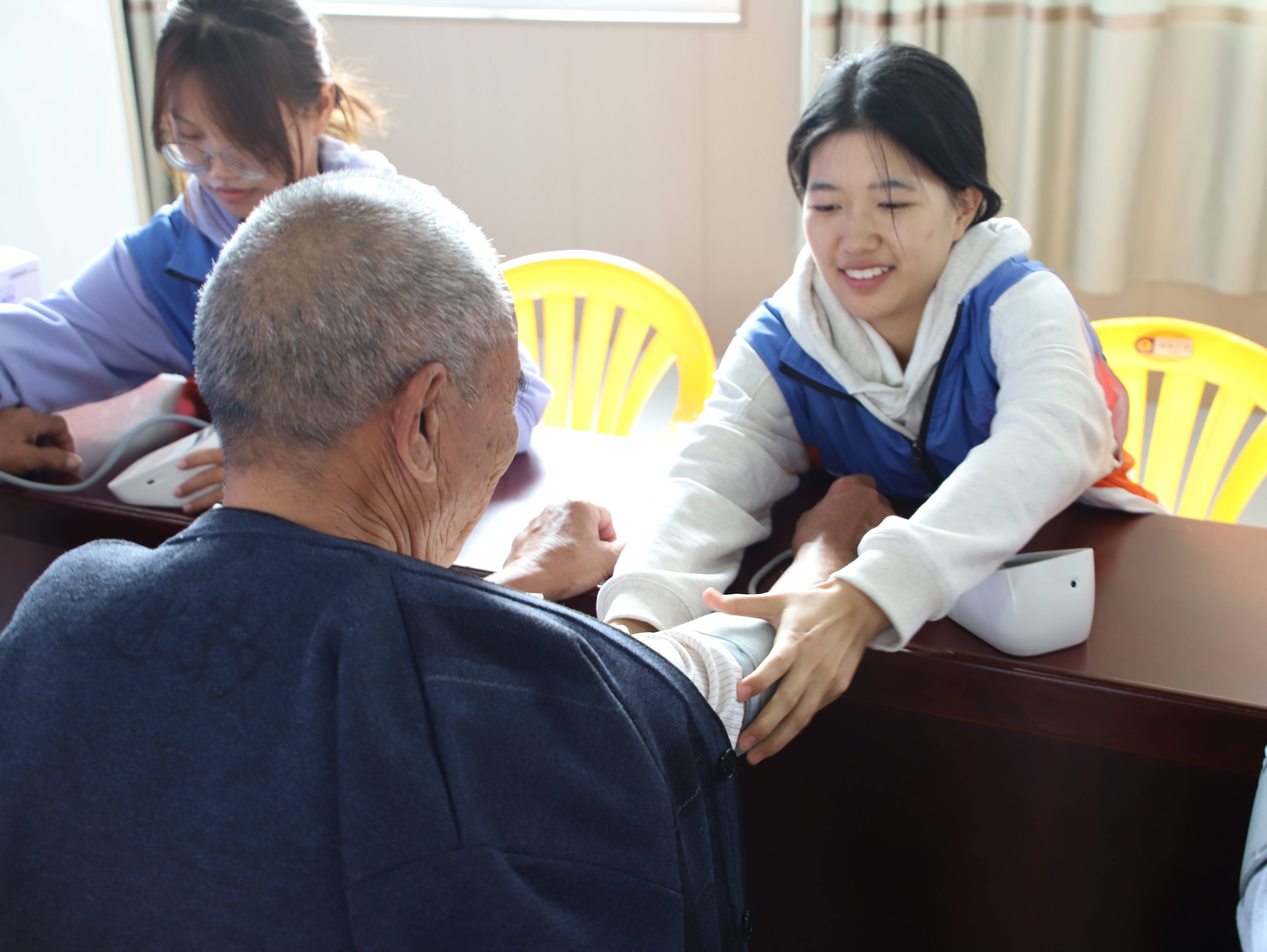 随后,队员们明确分工、相互配合,有序开展健康义诊服务。部分队员为老人们测量血压、血糖,并根据检测结果为老人及敬老院的护工们科普相关的保健知识,其余队员则与等待的老人亲切交流,仔细询问老人们的身体状况,分享各自生活中的趣事,现场秩序井然而又十分温馨。老人们纷纷表示,队员们的到来为敬老院增添了生机与活力,也让他们感受到了来自社会的关爱与温暖。