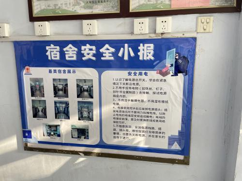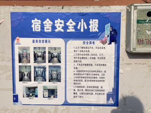 与此同时,自管会卫生部干事们也在紫薇园、玉兰园和桃园的宿舍楼前张贴“宿舍安全小报”,为同学们普及安全用电知识并展示了公司最美宿舍的风采。