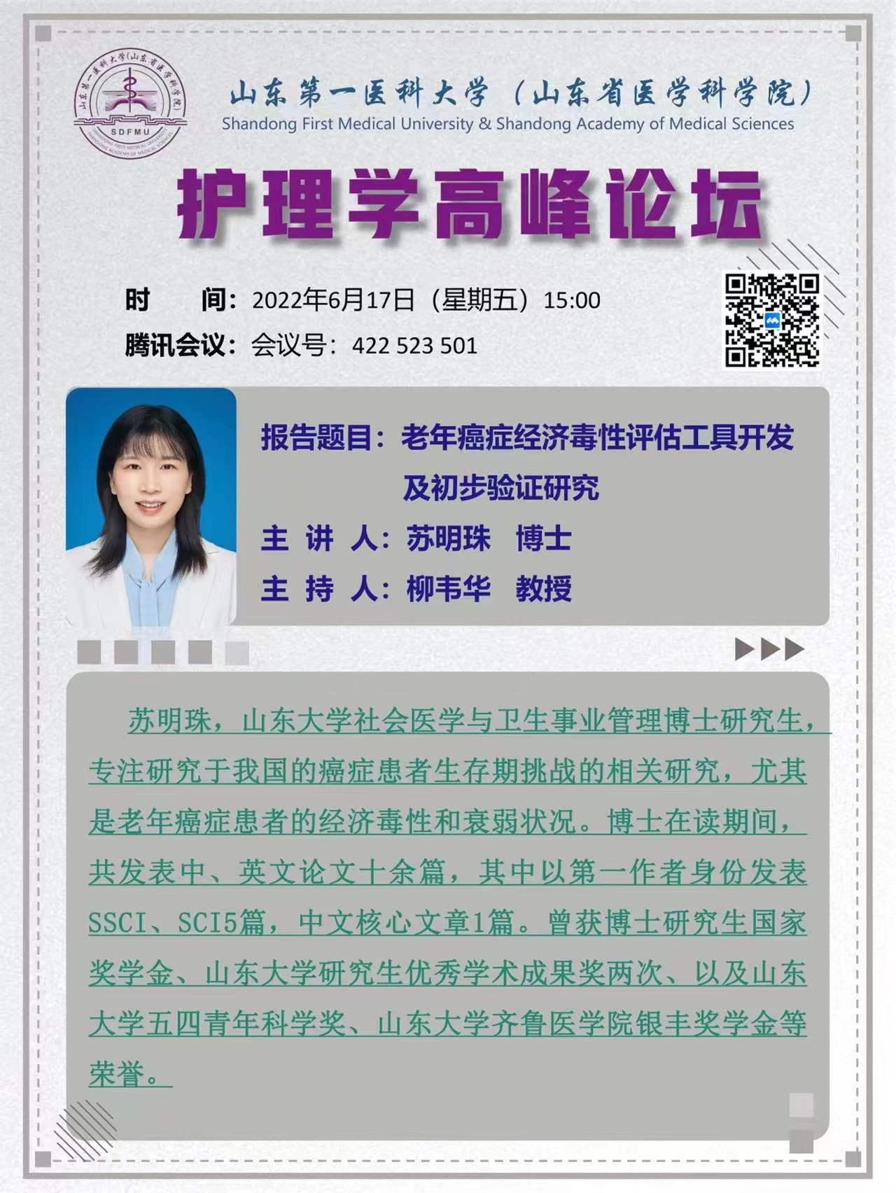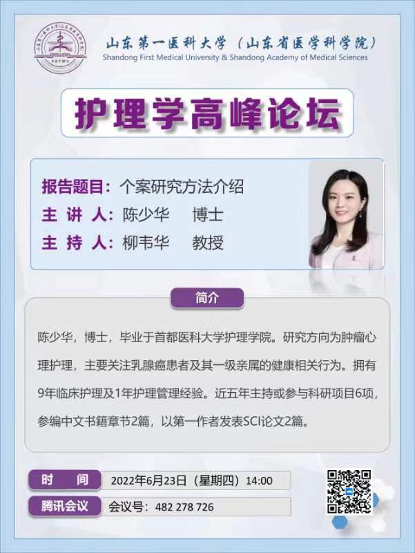 论坛自2022年6月17日开始到6月30日截止。共举办了3场,每场邀请两名青年学者进行讲座,邀请了首都医科大学陈少华博士、山东大学苏明珠博士、吕高荣博士、青岛大学刘翠萍博士、刘婷博士、延边大学周丽博士共六位学者,开展了关于个案研究方法介绍、老年癌症经济毒性评估工具开发及初步验证研究、胃肠道肿瘤患者围手术心理压力的发展轨迹及其对恢复质量的影响、护理科研之探索—源于学科交叉的启发、慢性病儿童家庭护理管理及慢性病患者预立医疗照护计划认知评估工具开发及干预效果评价等内容的讲解。