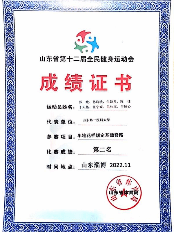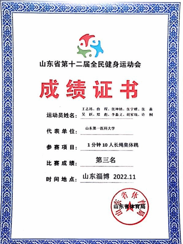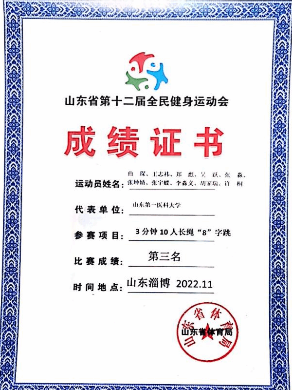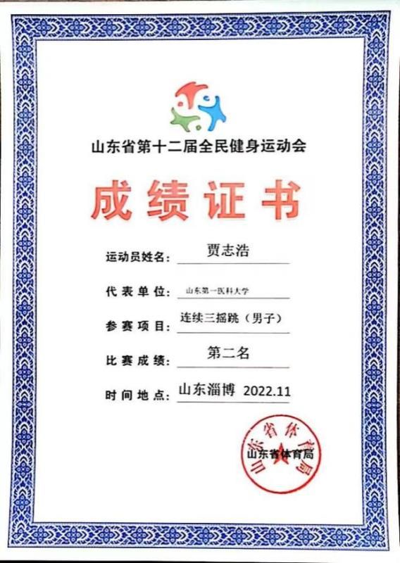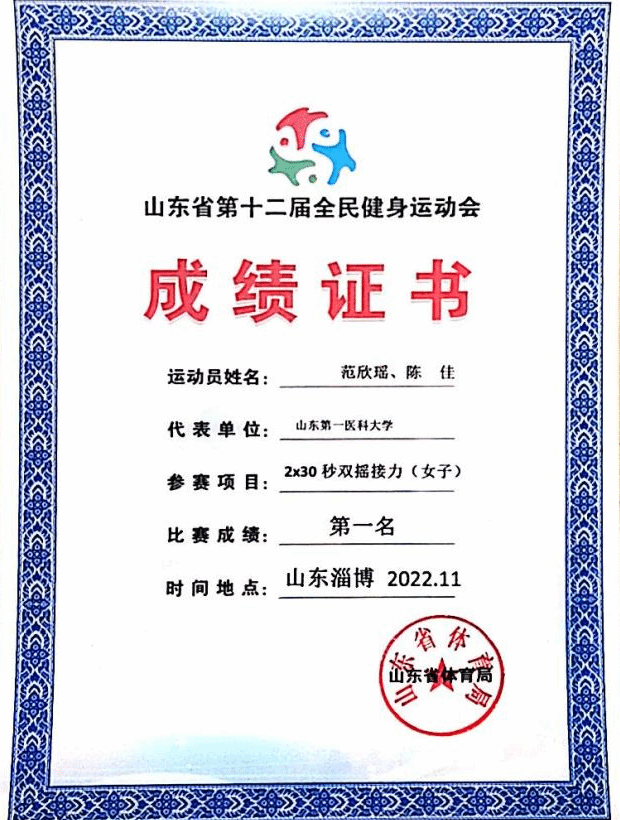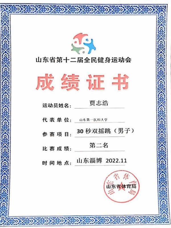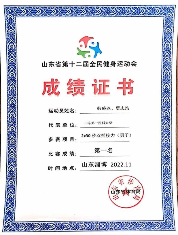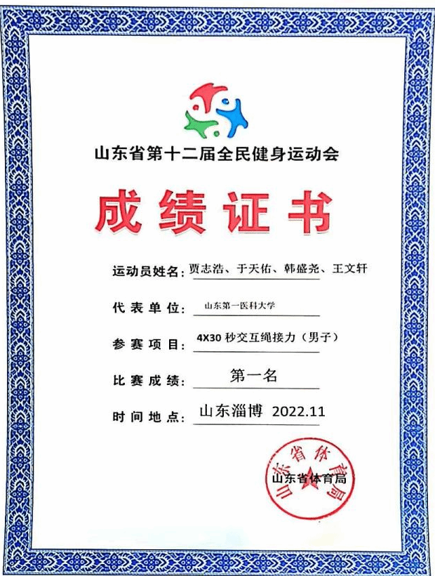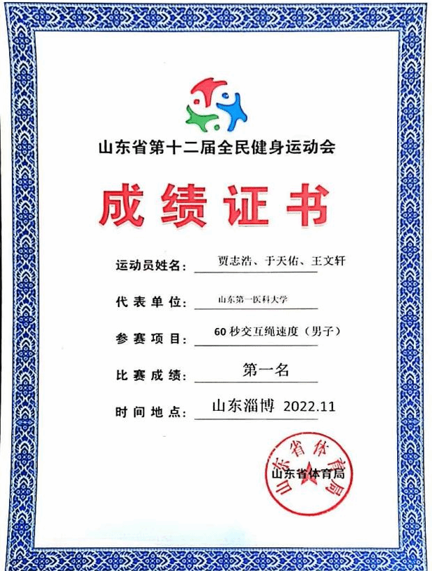 近日,由山东省体育局主办的山东省第十二届全民健身运动会线上跳绳比赛圆满结束,护理学子贾志浩、田笑、范欣瑶、胡家瑞和曲琛等五名同学积极参赛,发扬山一大“自强不息”的精神,为校(院)取得多项优异成绩。