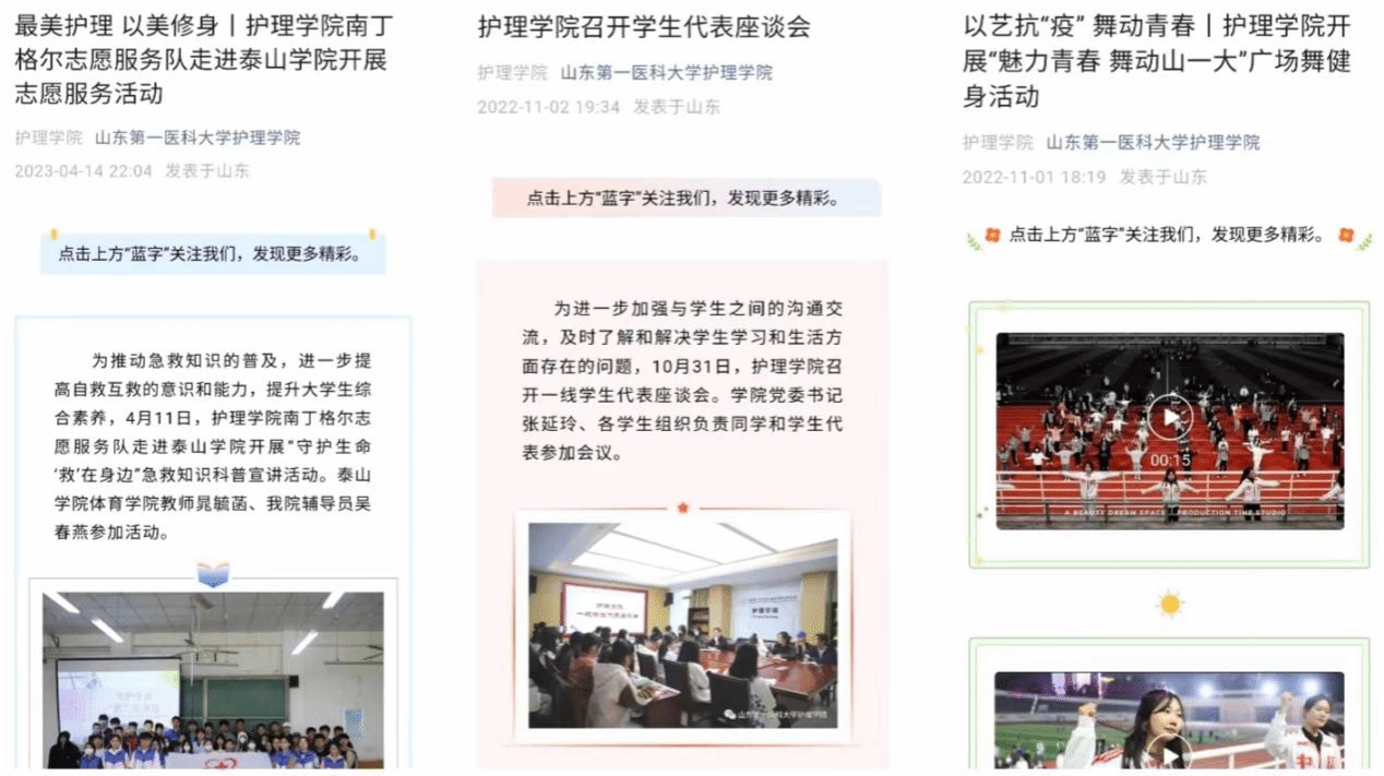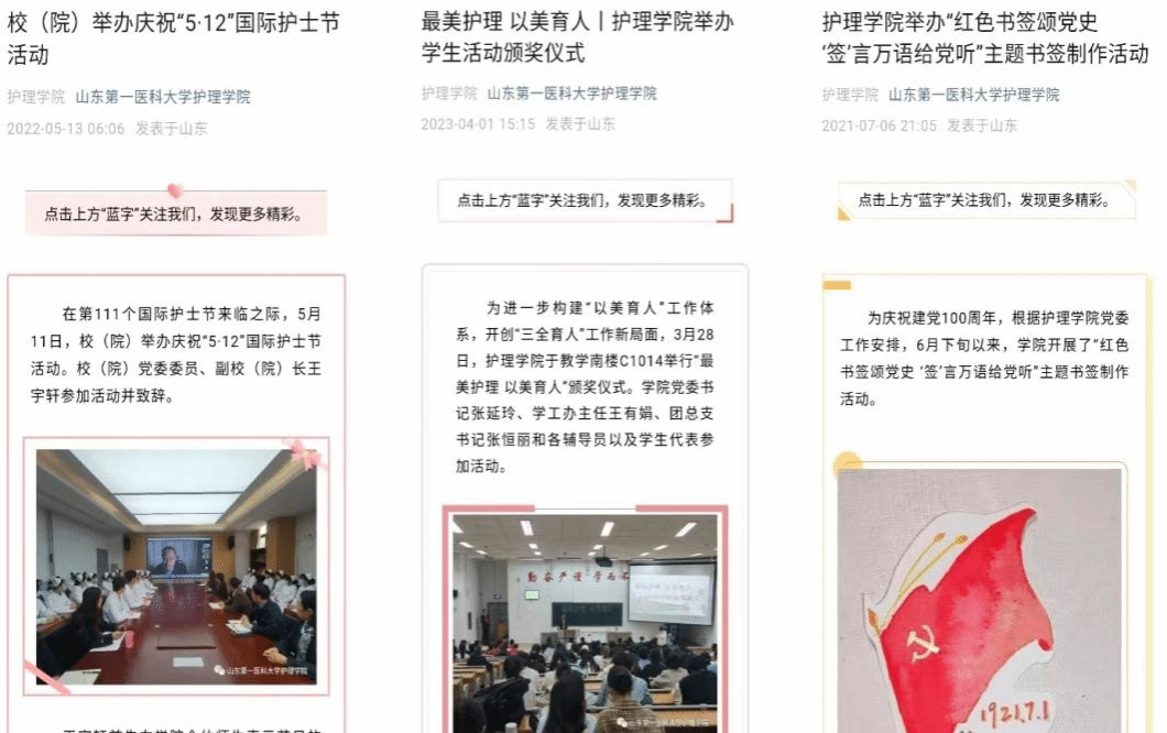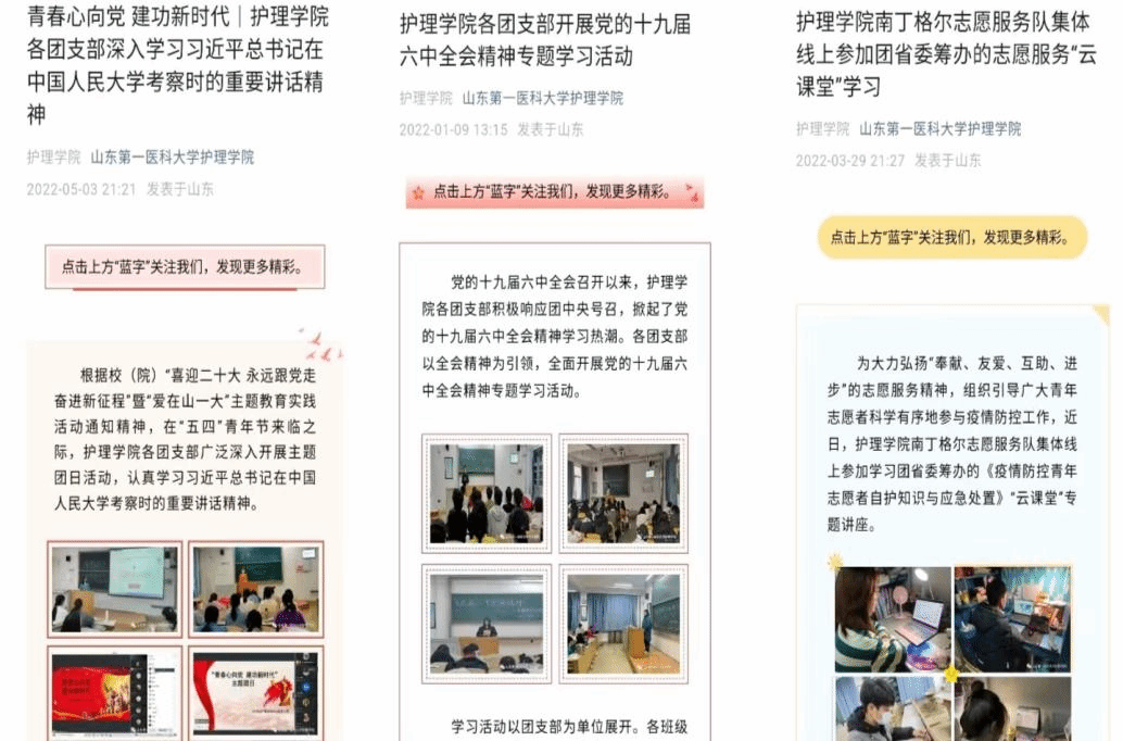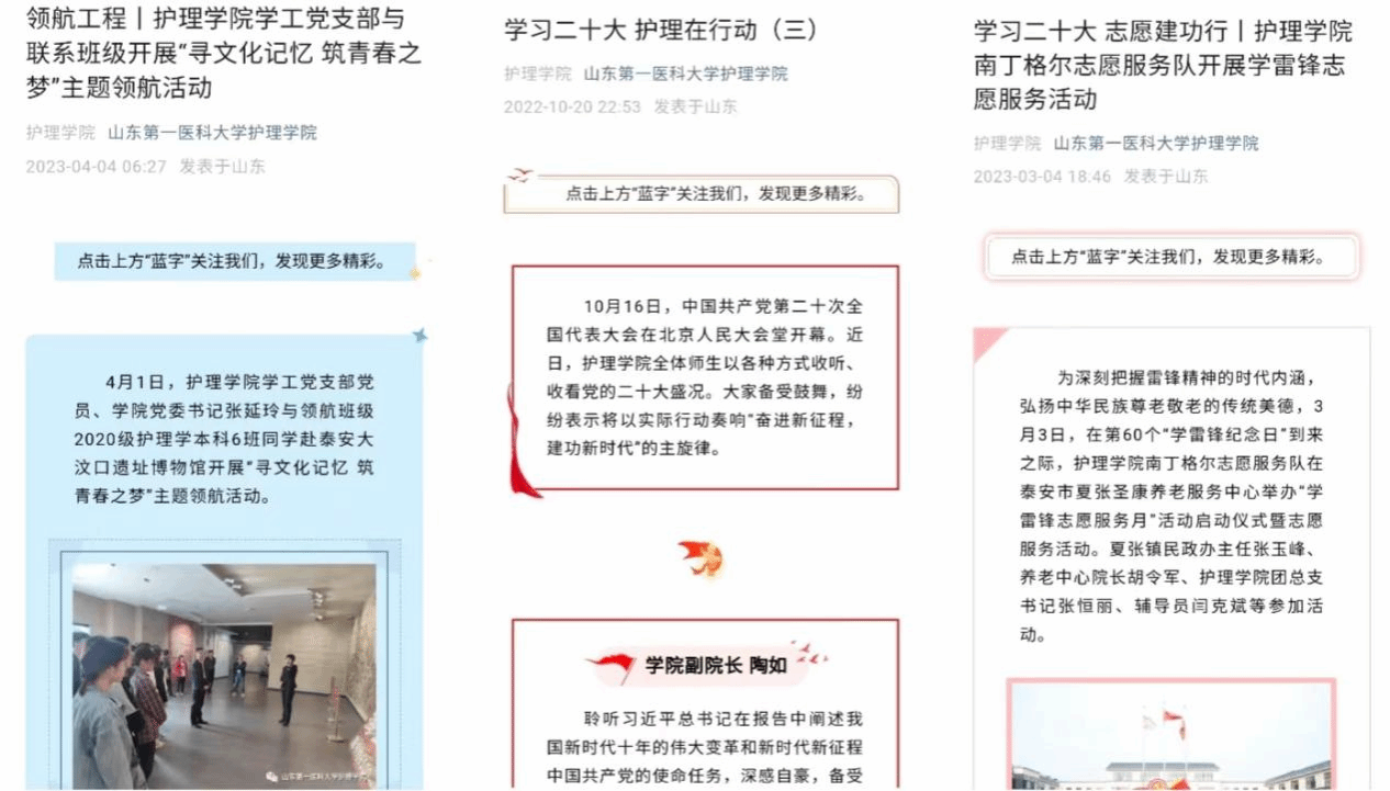 采用“线下”+“线上”的方式,线下开创“红色宣讲团”,创新开启小班宣讲模式,将党的故事宣讲好、传播好、实践好;加强蓝鲸体育和南丁格尔志愿服务队两个微信公众号的建设,线上推出“学习二十大 护理在行动”“学习二十大 志愿建功行”、红色大讲堂、“护”理党史等系列推文,强化舆论阵地。