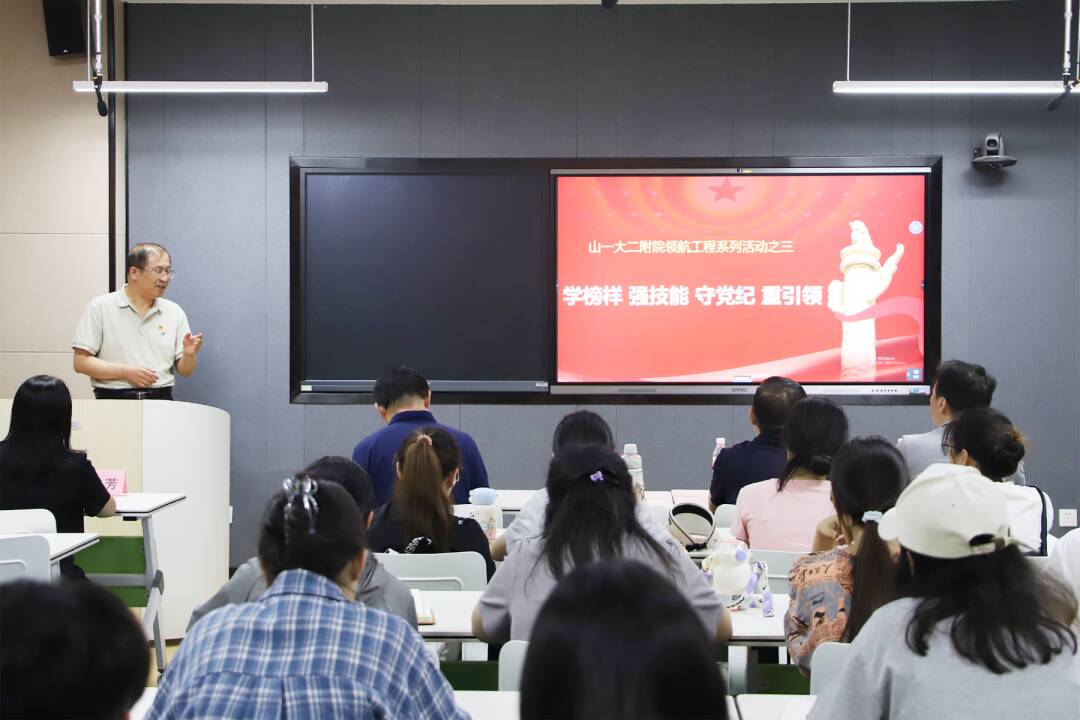 7月1日下午,山一大二附院心血管内科党支部与2022级护理学(麻醉方向)本科9班开展了以“学榜样 强技能 守党纪 重引领”为主题的领航活动。二附院内科党总支书记邓仰欣、内科一支部书记董炳庆参加活动,公司党委副书记林桦主持活动。