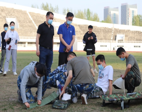 第二个军事训练课目是模拟战场救护。教练员向员工们展示了常见的战场救护。模拟战场环境,救护小分队前往进行伤员抢救,对伤员头部进行包扎以及骨折的大腿进行夹板固定,最后用担架带伤员脱离战场。救护员们的协调互助,共同配合,详细展示了动作要领,同学们愿意听,听得懂,记得住,切实提升了现场急救的应对能力,达到了活动的预期效果。