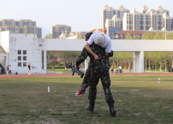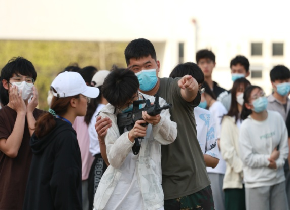 首先开展军事项目体验活动,同学们真切感受到了一堂“真抓实练,军人本色”的国防教育课。在强军社同学详细指导下,同学们了解了激光打靶的规则与技巧,学习了徒手组合练习以及投掷手雷的方法,他们的讲解为同学们提供科学的方法和实用的技巧,在场的师生纷纷上前体验。