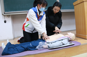 此次活动中,一名主讲人负责用PPT讲解心肺复苏的相关知识,主要为同学们详细讲解了单人成人心肺复苏操作方法及其要领。此外,主讲人也给同学们普及了自动体外除颤器(AED)的相关知识,并强调了掌握急救知识和技能的重要性。讲解过程中,两名队员负责操作示范,配合默契,同学们认真倾听讲解内容,积极回答问题,气氛十分活跃。示范结束后,志愿者邀请参与学习培训的同学们借助假人模型进行实操练习,同时耐心地指导和纠正同学们的操作,帮助他们掌握正确的操作方法,使同学们很快掌握了胸外心脏按压和人工呼吸的基本操作要领。