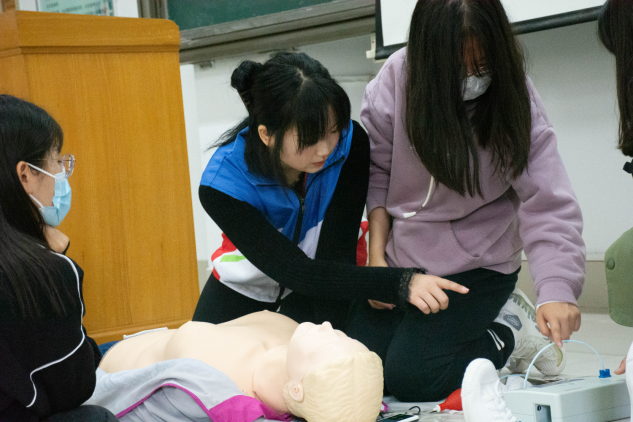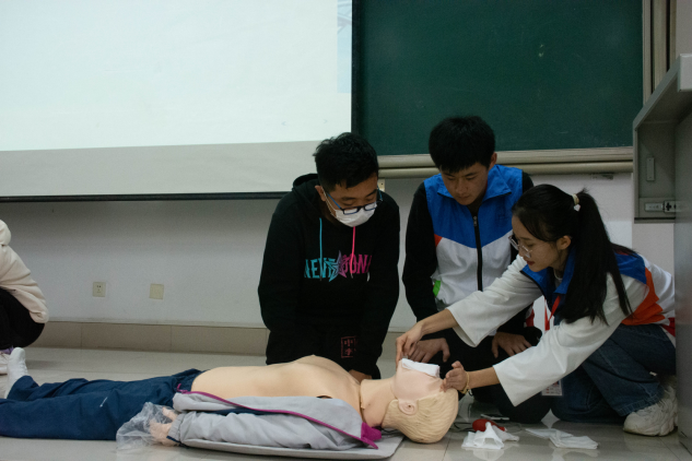 活动中,志愿服务队队员借助多媒体课件、假人模型、AED(自动体外除颤仪)为同学们详细讲解了AED(自动体外除颤仪)和单人成人心肺复苏的相关知识,并演示了心肺复苏的实际操作。操作过程中同学们仔细观看、认真学习并且积极与志愿者互动。期间还向志愿者咨询了一些自己感兴趣的急救知识,得到了志愿者的认真回答。讲解结束后,志愿者邀请同学们借助假人模型进行练习,并耐心仔细地指导同学们的每一个动作和要领。