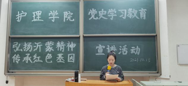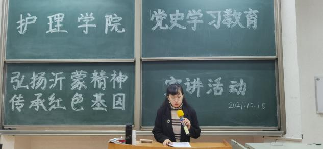 10月15日,蓝鲸体育“红色宣讲团”于教学南楼A3006继续开展“弘扬沂蒙精神 传承红色基因”宣讲活动,2019级护理学本科7-8班、2020级护理学专升本1-2班约180人参加宣讲会。