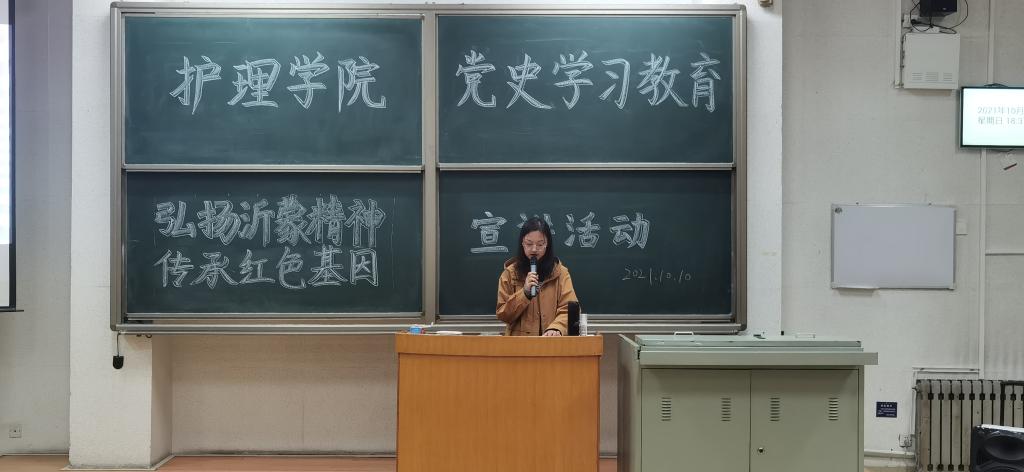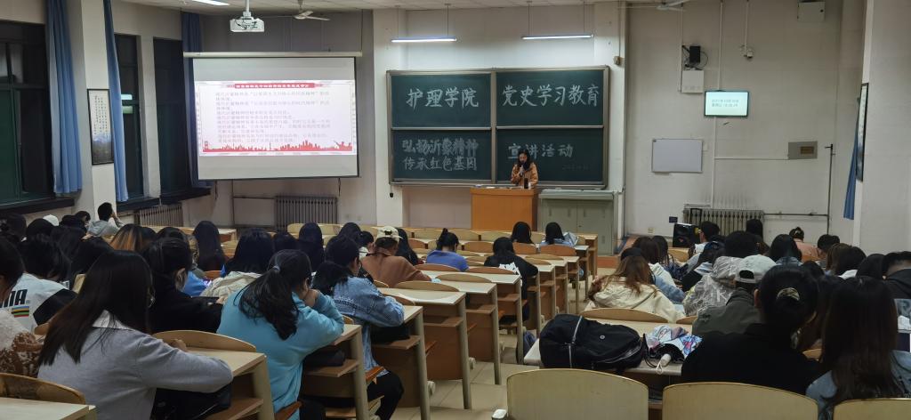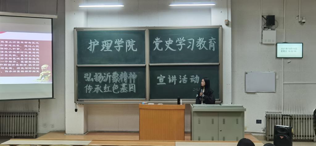 为庆祝中国共产党成立100周年,更好教育引导当代老员工学习和弘扬红色革命精神,10月10日,蓝鲸体育“红色宣讲团”于教学南楼A3006继续开展“弘扬沂蒙精神 传承红色基因”宣讲活动,2019级护理学本科4-6班同学约130人参加宣讲会。