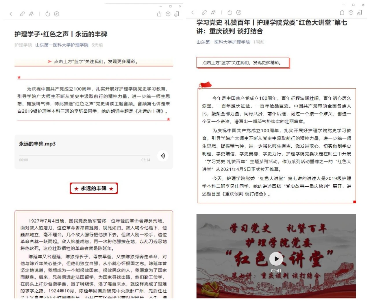 公司党委强化“互联网+”党建工作思维,通过公司微信公众号平台,先后推出“学习党史 礼赞百年”红色大讲堂、红色之声、“护”理党史等主题系列线上活动,目前线上已推出20余节党史主题的党课,实现了党课掌上学、随时学,把思想政治教育的“大喇叭”变成方便快捷的“随身听”,将新媒体“小平台”变成拓展党课覆盖面的“大磁场”,公司形成“线上线下同步”的党课学习环境。