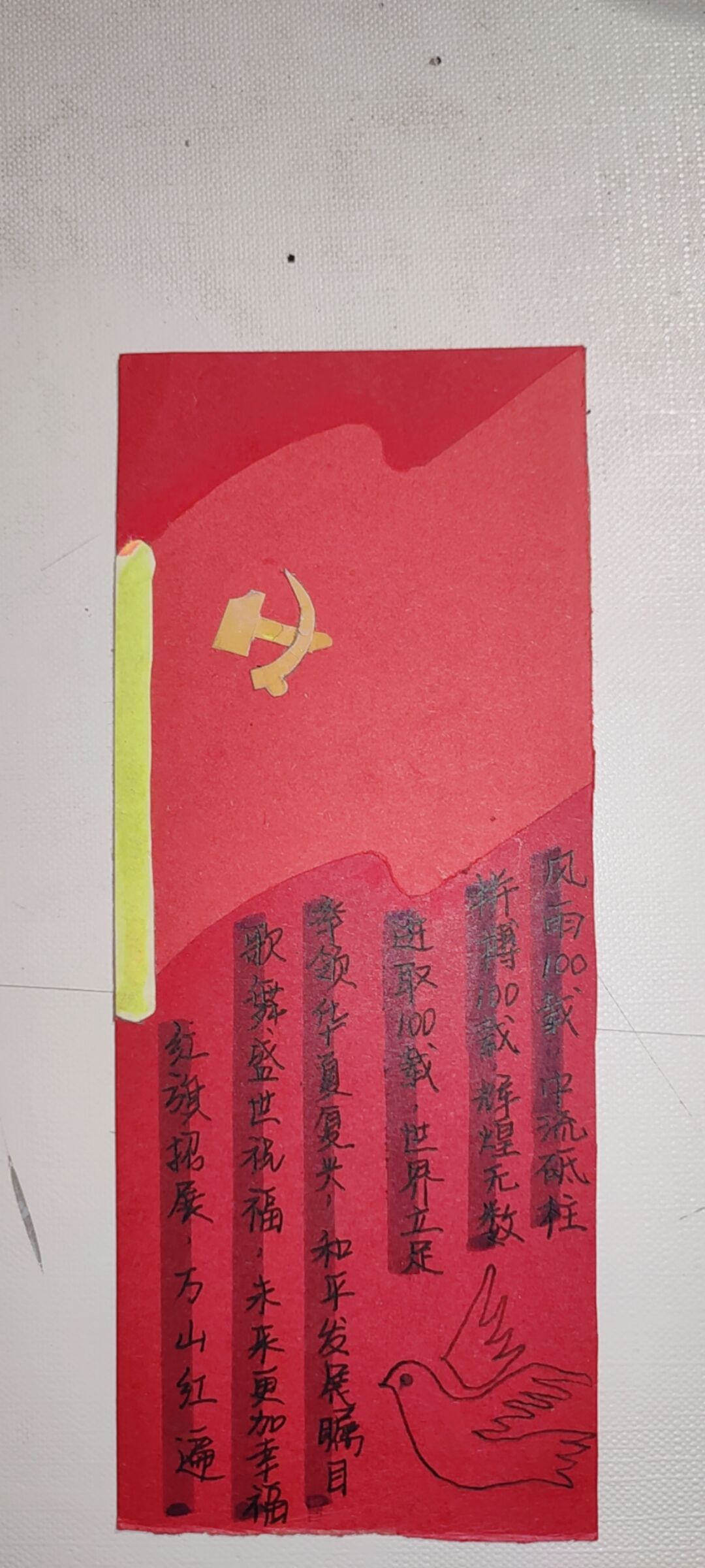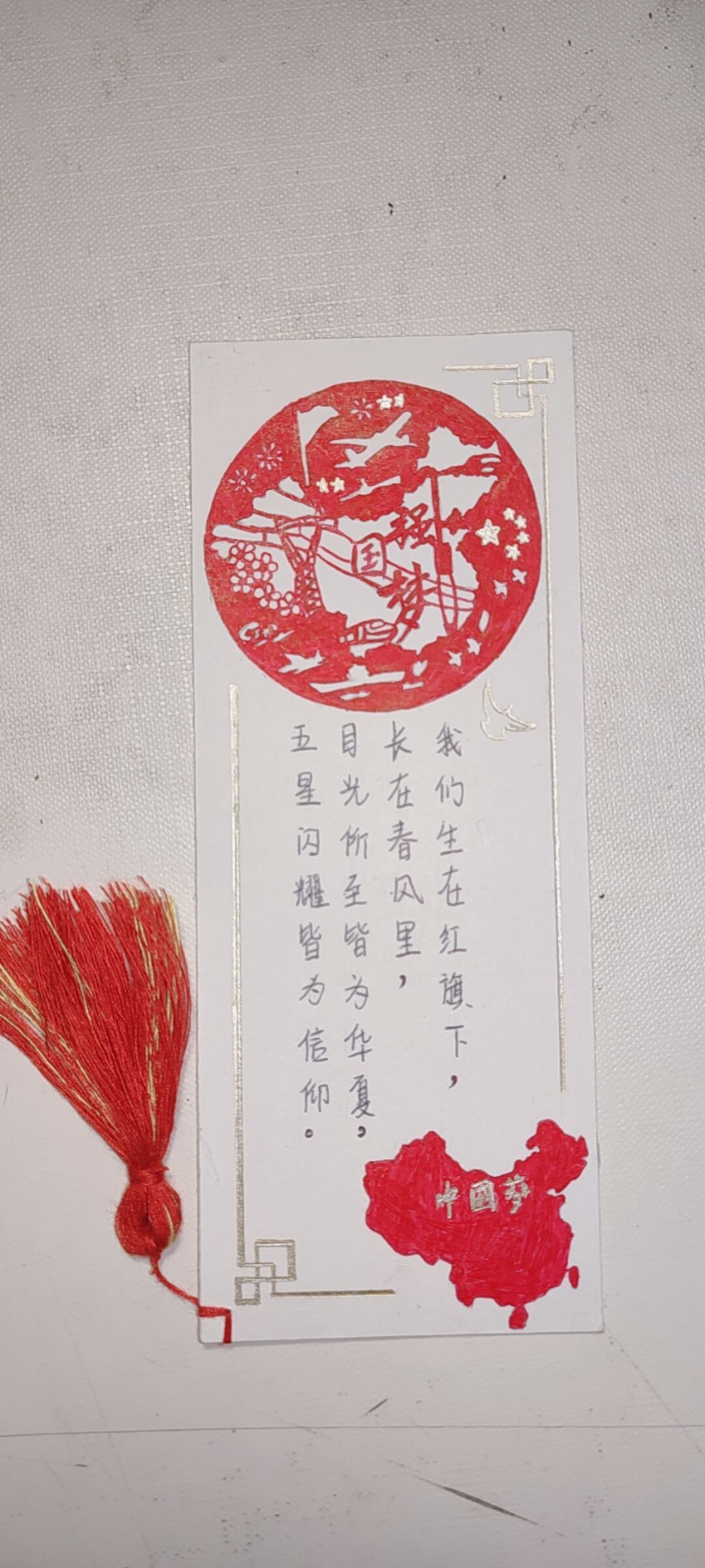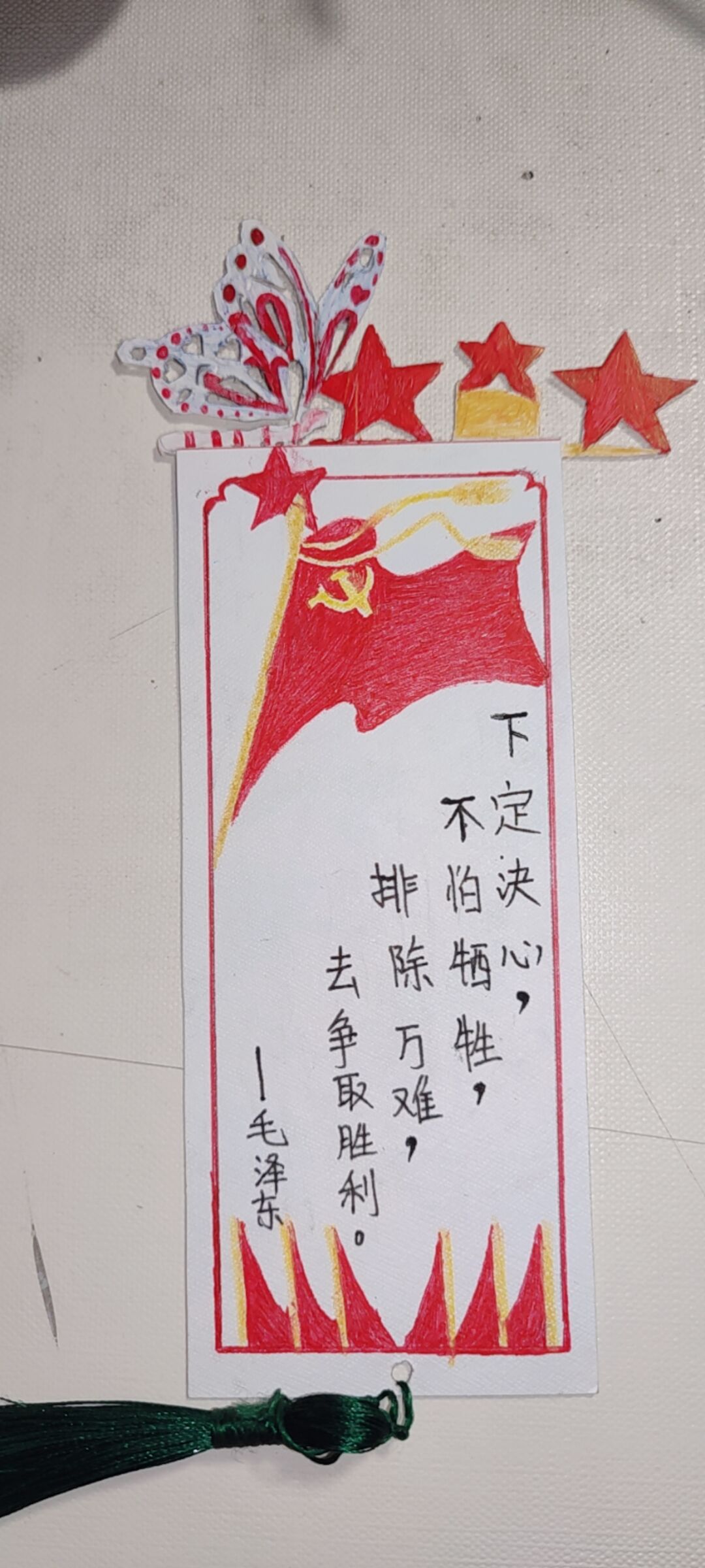 一方书签,一段历史,在制作过程中,同学们能够更加深刻把握党史中的重要事件、典型物件、爱国爱党模范人物等,同学们对党对国家的热爱与自豪充分展现。