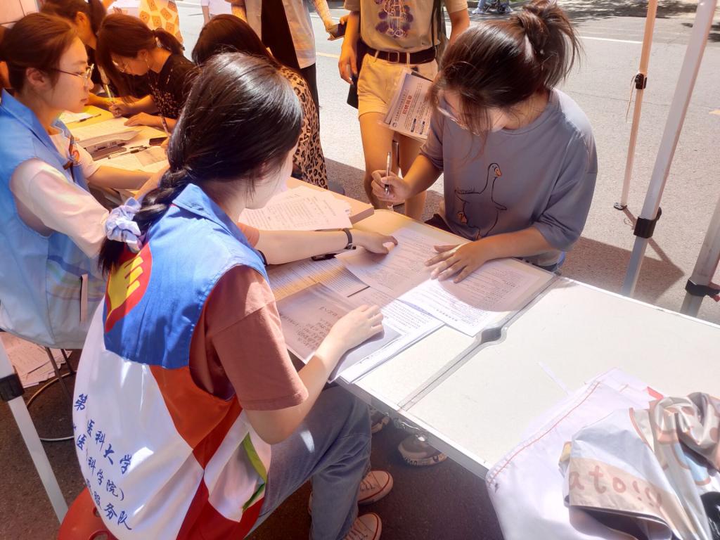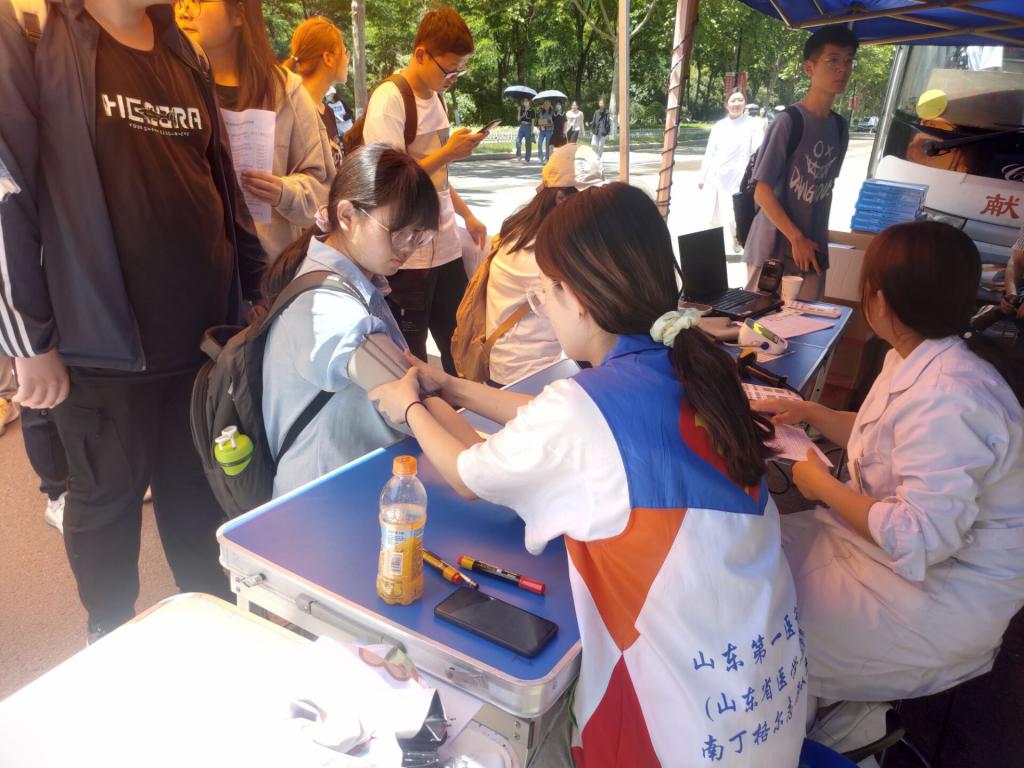 活动当天,在青志与服务队志愿者的引导下,参与献血的同学逐一填表、登记、抽血、观察,同时对路过的同学们解疑答惑,让更多人了解无偿献血的有关知识,鼓励他们为公益事业奉献自己的一份爱心。现场各项工作有条不紊地进行着,整个献血流程秩序井然。正午的烈日也阻挡不了同学们献血的热情,在献血车前排起了长龙,志愿者们为此额外设置了两处遮阳棚提供阴凉。志愿者们还为献血者提供了小礼物,把这份澎湃的爱心热潮在每一位学子心中传递。现场共434人参与献血,共计献血量120100ml。