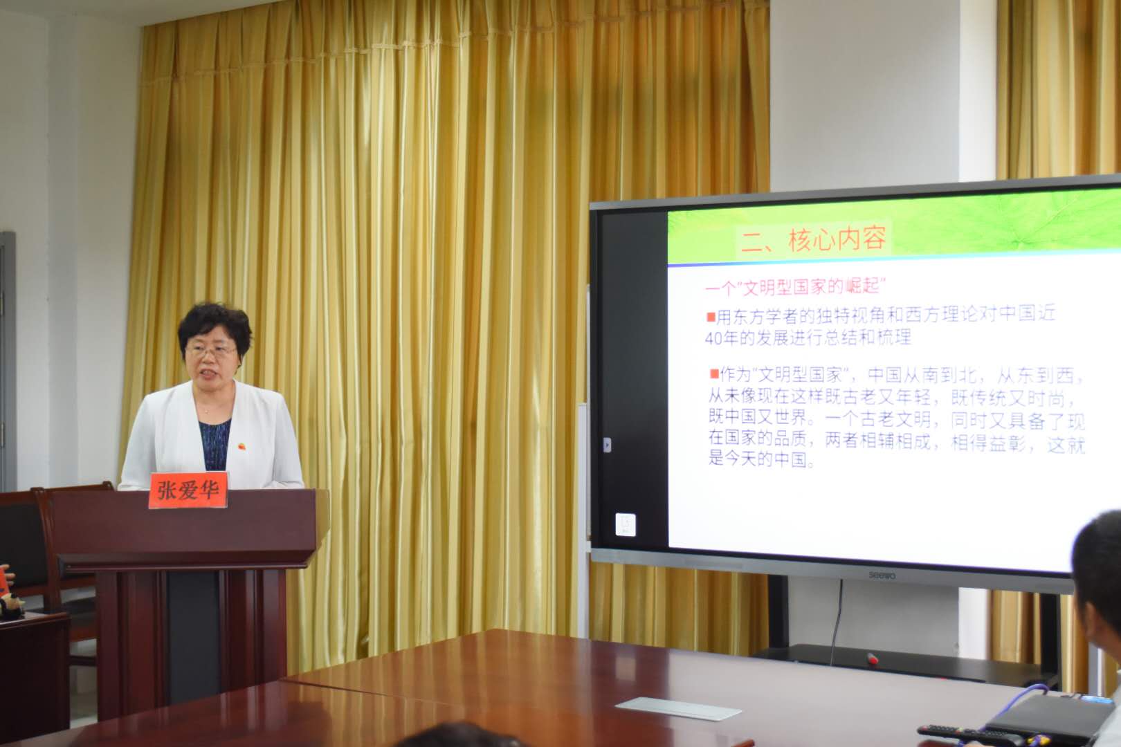 外妇、实验党支部书记张爱华以《中国——一个“文明型国家”的崛起》为题,分享了复旦大学张维为教授的三本书:《中国超越》、《中国震撼》和《中国触动》以及他主讲的64集系列片《这就是中国》。“民生为大”“整体思维”“良善政治”,这是张爱华最大的体会,同时她相信我们通过学习也会更加理解中国为什么必须要有中国共产党的领导,也会更加热爱我们祖国。