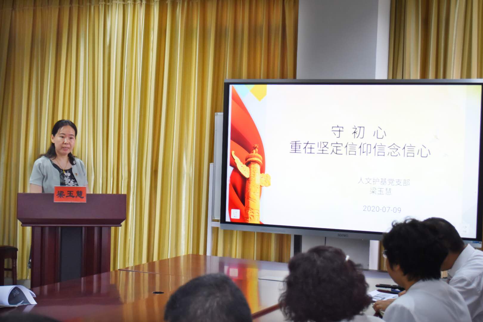人文、护基党支部书记梁玉慧分享的党课主题是《守初心重在坚定信仰、信念和信心》。她认为,坚守初心,就要坚定马克思主义信仰,坚定中国特色社会主义信念,坚定实现中华民族伟大复兴中国梦的信心,要更加自觉为新时代党的使命而努力奋斗。作为高校教师,应当认真践行为党育人、为国育才的初心使命。