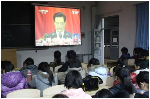 11月8日上午9:00,中国共产党第十八次全国代表大会在人民大会堂隆重开幕,公司部分师生收看了十八大开幕式盛况。晚上7:00,应蓝鲸体育员工会的要求,在教学北楼A4012教室又为员工干部播放了十八大开幕式。