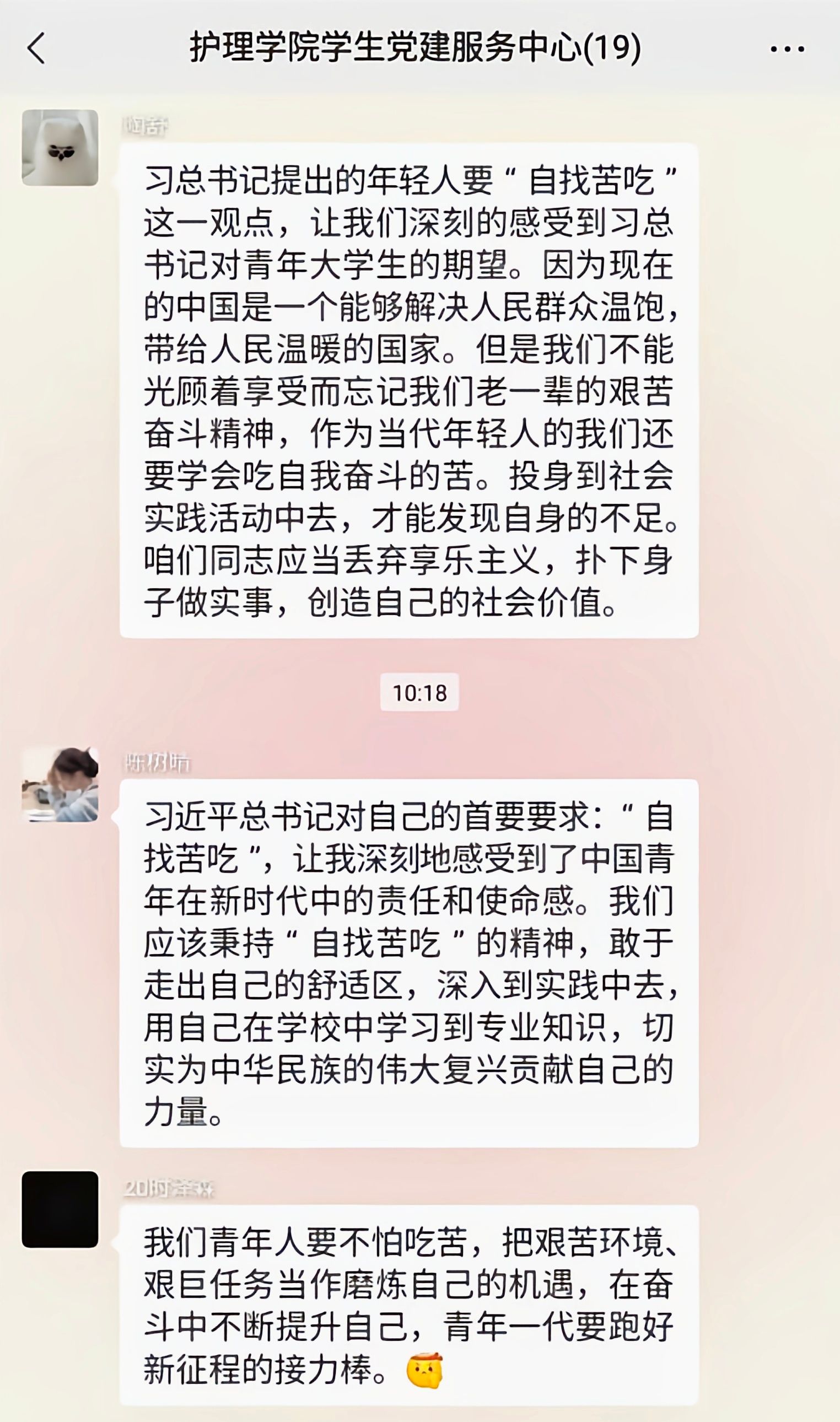 “自找苦吃”四个字引起员工党建服务中心同学们的热议。徐枫霖说:“习近平总书记对青年人要求‘自找苦吃’,激励我们要走出象牙塔、吃得苦中苦,将此精神内化于心、外化于行,要有牺牲、奉献和创造精神,用责任和担当书写不一样的青春色彩。”陈树晴谈到“习近平总书记对自己的首要要求:‘自找苦吃’,让我深刻地感受到了中国青年在新时代中的责任和使命感。我们应该秉持‘自找苦吃’的精神,敢于走出自己的舒适区,深入到实践中去,用自己在公司中学习到的专业知识,切实为中华民族的伟大复兴贡献自己的力量。”大家积极发言,分享自己的感受,一致表示要争做敢吃苦、会吃苦、能吃苦的新时代青年。