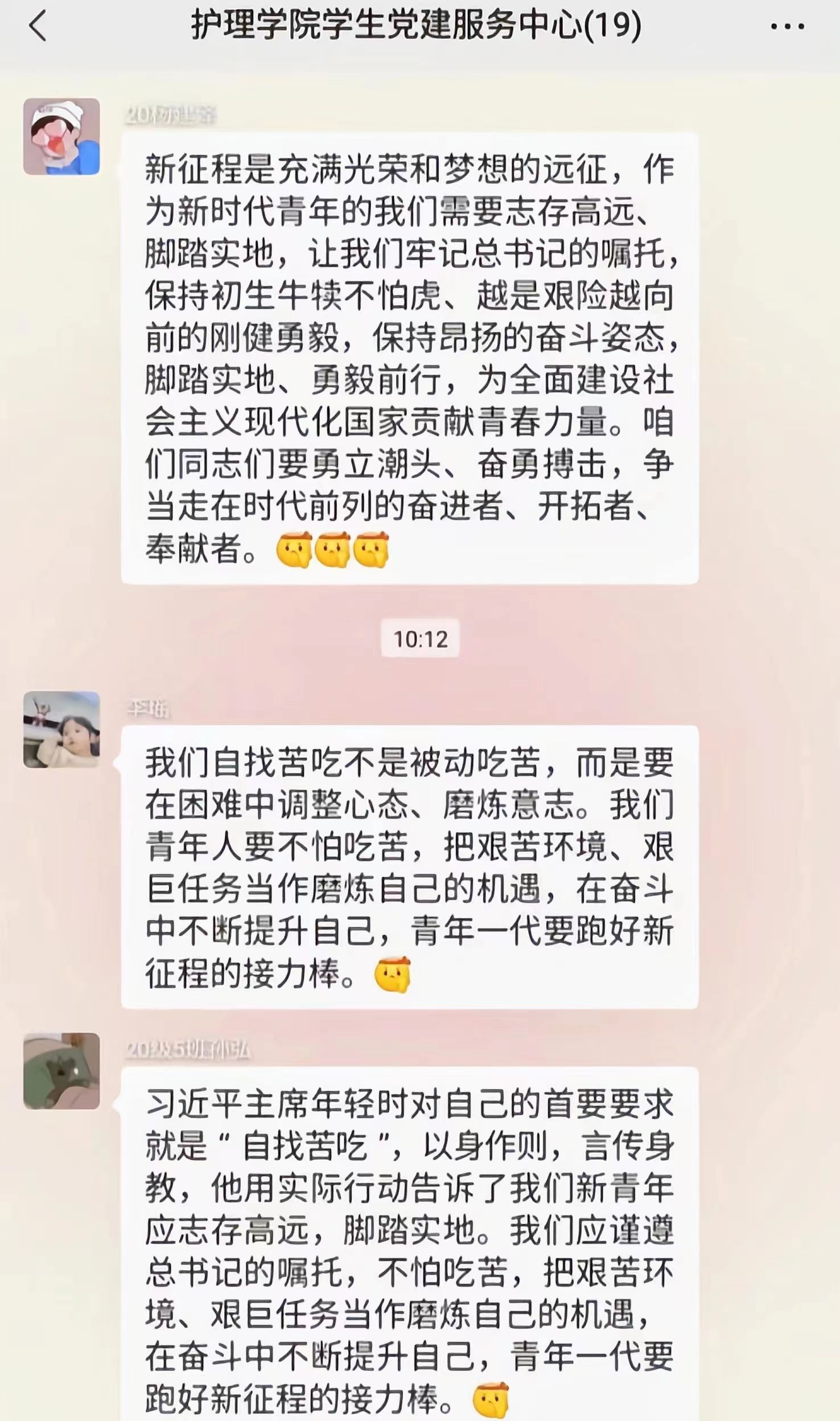 公司党委要求,全体护理学子都要认真学习《习近平给中国农业大学科技小院的同学们的回信》,坚定不移听党话、跟党走,怀抱梦想又脚踏实地,涵养“自找苦吃”的精气神,不负时代,不负韶华,不负党和人民的殷切期望,为实现中华民族伟大复兴贡献自己的应有力量。