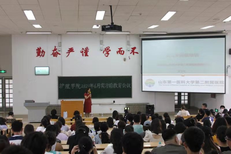 王玉华向同学们讲解了入院实习的过程和任务,解答了同学们所关心的带教、考核和请假问题,分析不同实习阶段的同学们的心理状态并提出了顺利渡过实习期的建议,帮助同学尽快完成员工与护生之间的角色转换。同时,王玉华也对实习同学提出了几点期望和要求,希望同学们在实习工作中能做到“嘴勤、手勤、脚勤”,具备足够的“爱心、耐心、细心、责任心”,敬畏生命,敬畏职责。