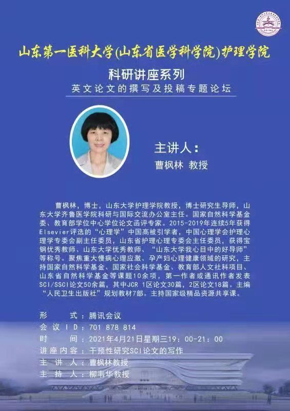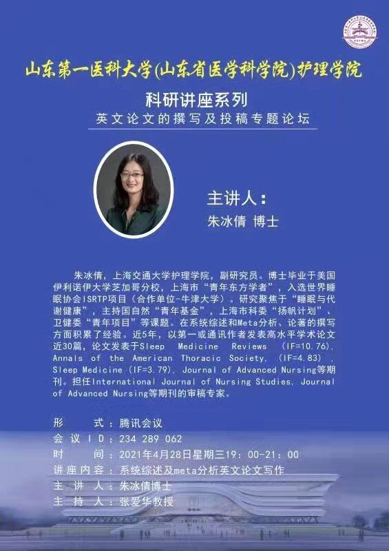 论坛自2021年4月15日起陆续开展,每周邀请一名专家进行讲座,目前已邀请海军军医大学桂莉教授、山东大学曹枫林教授、上海交通大学朱冰倩博士三位学者开展了《教学类SCI论文的写作》、《干预性研究SCI论文的写作》、《系统综述及meta分析英文论文写作》讲座。三位学者的讲座思路清晰,重点突出,层次分明,广大师生纷纷表示受益匪浅。后续,论坛即将迎来海军军医大学王婧婷博士、解放军医学杂志编辑部主任余党会、首都医科大学刘均娥教授的精彩讲座。
