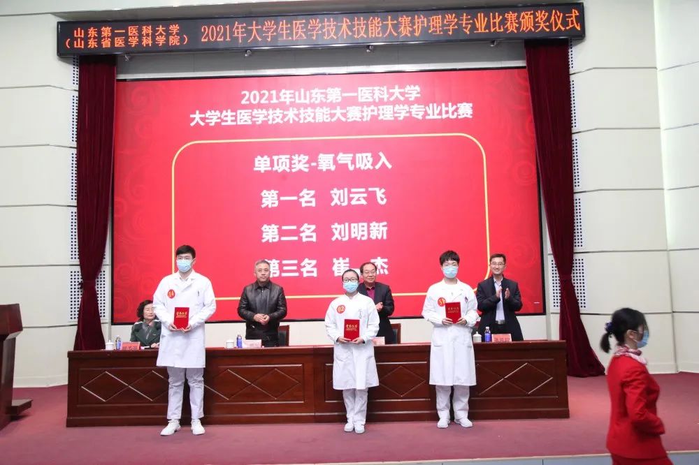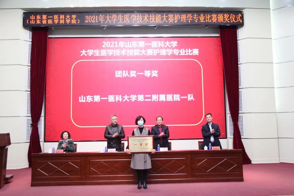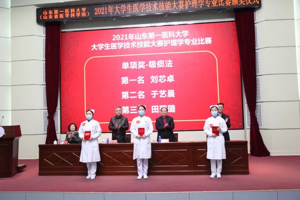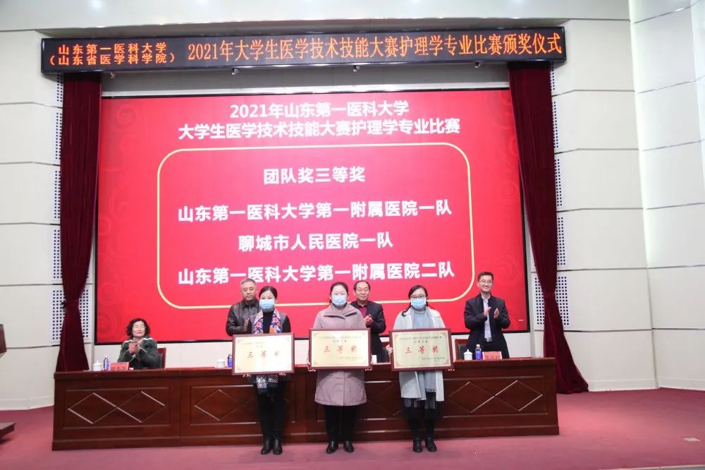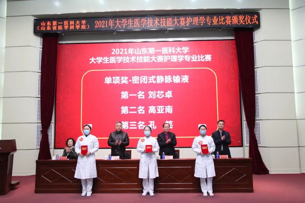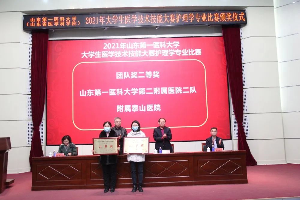 典礼上,首先由大赛组委会总裁判高英丽对比赛进行总结并宣布获奖名单。第二附属医院一队获得团体一等奖,第二附属医院二队、附属泰山医院获得团体二等奖,第一附属医院一队、附属聊城医院一队、第一附属医院二队获得团体三等奖。刘芯卓、高亚南、孔笑等三名同学分获密闭式静脉输液项目第一、第二、第三名, 刘云飞、刘明新、崔杰等三名同学分获氧气吸入项目第一、第二、第三名,刘芯卓、于艺晨、田璐璐等三名同学分获吸痰法项目第一、第二、第三名。