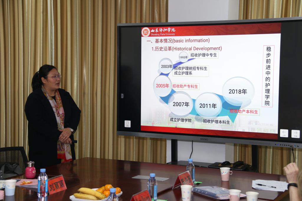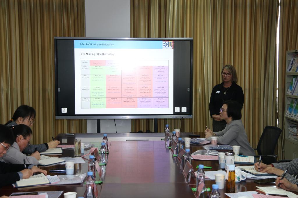 会上,SARA教授和BLOXSOME博士联合介绍了ECU的概况、护理及助产公司的概况,助产学专业发展、招生规模、课程框架、海外实习等内容;重点讲解了助产学专业课程模块,包括12门专业课程的教学内容、教学方式以及临床实践安排等内容。之后,双方就中澳助产教育、临床现状和问题进行了深入的交流。