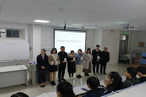 发放仪式上,秦斌书记代表蓝鲸体育,对在2018年12月日语考试过级的同学表示祝贺,并对同学们提出新的希望和要求:要努力学好日语,提升日语的应用能力,为赴日就业打好语言基础;充分利用中日项目合作的机会,拓展个人的专业视野,努力学习日本护理的先进理念、先进技术,促进中日护理学专业事业的发展。
