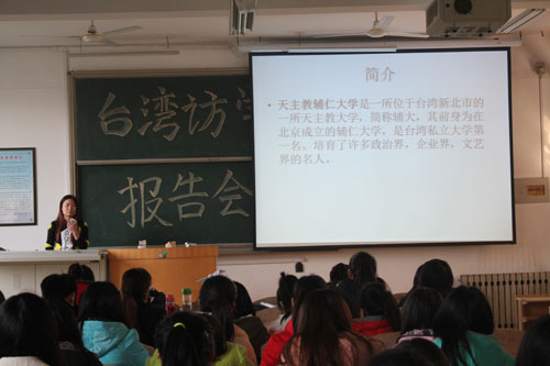 报告会上,赴台湾辅仁大学的交换生就此次访学的见闻与心得向同学们作了报告。她们向同学们展示了台湾辅仁大学独特的教学模式和优雅的校园环境。台湾辅仁大学在教学方法、考核模式、课堂组织、员工调动等方面有独到之处。教学模式灵活务实,员工参与度高,员工社团活动丰富多彩。