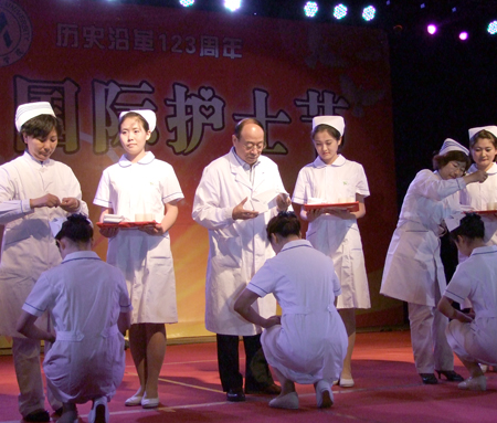 晚会还举行了护生授帽仪式。伴随着庄严的乐曲,王学春同公司及附院的护理前辈一同为即将奔赴临床一线的实习生授了帽。护生们面带微笑站在护理前辈面前,接受前辈为自己戴上圣洁的燕尾帽,接过前辈传递的火种,聆听他们真挚的赠言,许下自己无悔的誓言。一顶顶洁白的燕尾帽,象征着白衣天使的神圣;一个个甜美的微笑,象征着白衣天使的纯洁。肃穆的授帽仪式感动了在场的每一个人,大家共同见证了这一光荣而神圣的时刻。