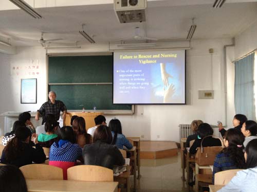5日上午9:00,DeFeo先生在教学北楼A4003开始了来校讲授《急危重症护理学》的第一节课,中英合作班员工、研究生和蓝鲸体育教师参与了课堂教学活动,Daniel J. DeFeo此次应邀来校除了为本科、专升本、中英合作专科三个层次员工讲授《急危重症护理学》部分课程外,还将与公司男护生进行座谈、为公司教师讲授专业英语、参观附属医院急诊科等相关活动。
