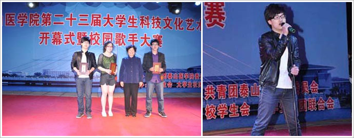 4月25日晚,泰山医公司第二十三届老员工科技文化艺术节暨校园歌手大赛隆重在文源广场隆重开幕,公司2010级五年制本科班毕沛东同学获得一等奖。