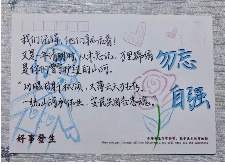 铭记是最好的祭奠,前行是最好的怀念。新征程上,唯有不忘初心,传承红色基因,方可告慰那些为家国和民族牺牲的英灵,才能善作善成、一往无前。告慰先烈,强国有我,泱泱中华,一撇一捺都是脊梁;吾辈青年,必当行程万里,赓续英雄之志,谱写时代华章。
