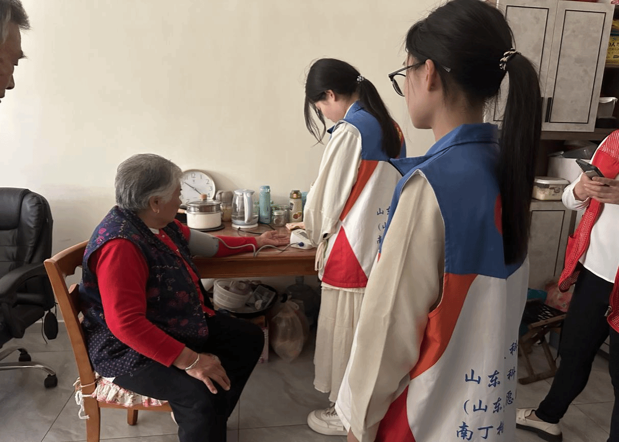 随后,队员们跟随社区工作人员前往居民家中开展入户健康义诊,为居家老人测量血压,详细讲解了慢性病的常见症状、预防与控制方法等相关知识,让老人们对慢性病有了更深入的认识。队员们热情负责的服务态度赢得了居民们的连连夸赞。在为一位老人测量完血压后,他赞许地对队员们说:“感谢你们,我们现在足不出户都能享受到这样的服务了,你们的服务很到位。”