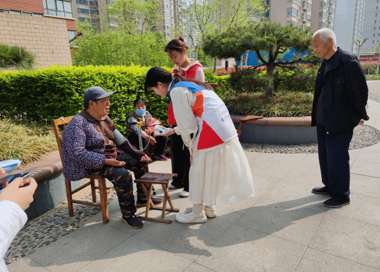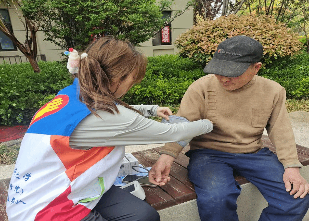 活动当天,队员们分为三组,有序开展了测量血压、手指操教学等志愿服务。队员们在社区活动广场为居民测量血压,并结合测量结果为他们提供健康生活的建议。此外,队员还为在此地休息的老人们详细介绍并演示了老年手指操的方法步骤,耐心地带领他们反复练习。