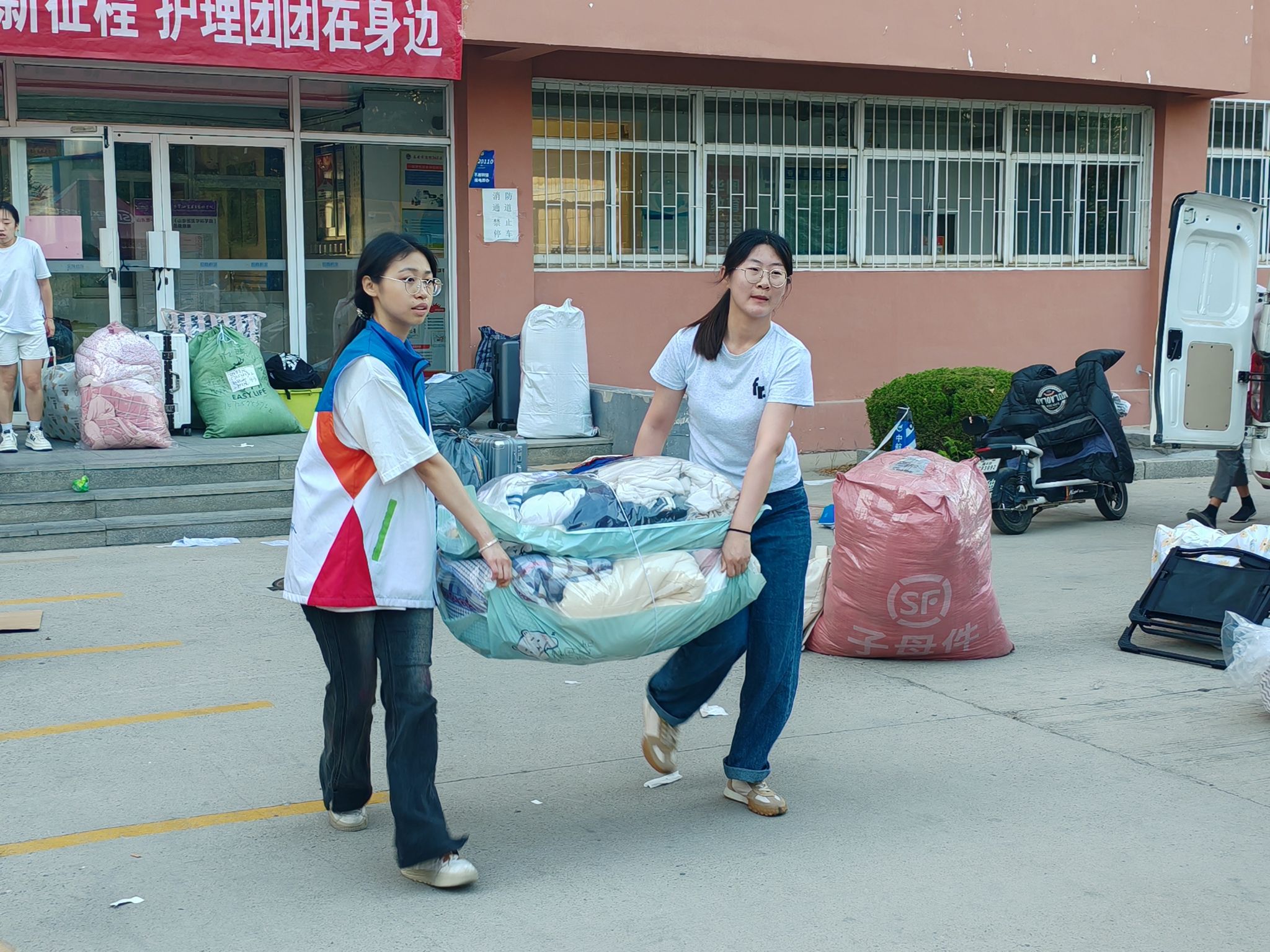 在这里,21级的同学们将大公司园生活暂时存档,挥别过去,迎接实习生活的新篇章。而志愿者们则像一群勤劳的蜜蜂,进进出出,不辞辛劳地忙碌着。他们接过手中的行李,犹如接过了一份“新的传承”。这不仅仅是简单的送别,其中有不舍、有祝福,更意味着传递“最美护理”之薪火,续写护理学子芳华新篇章。