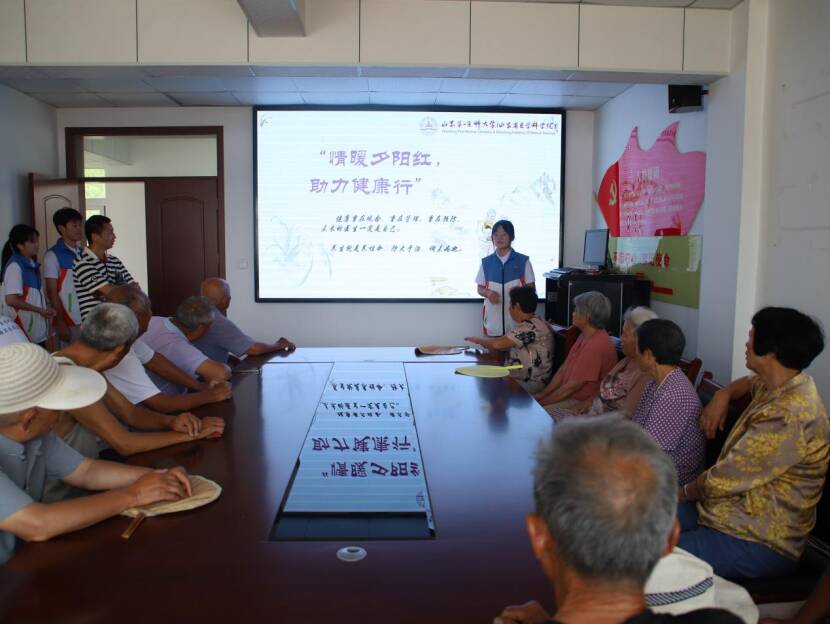护理学子前往东平县新湖镇窦府营村,在村委会,借助PPT向村民介绍了戒烟和老年护理的相关知识。