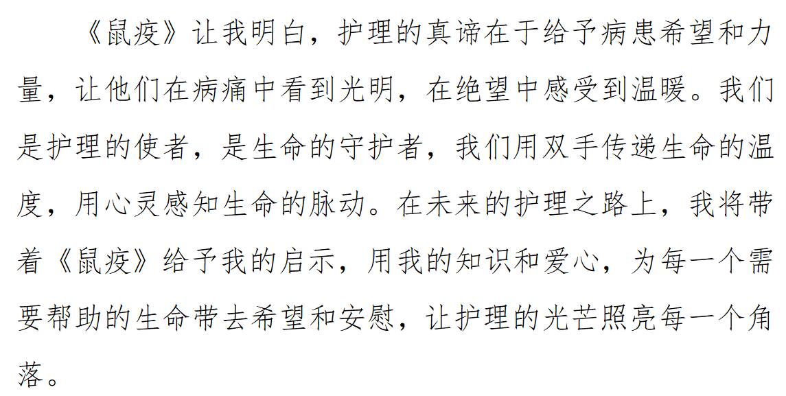 读懂生命,珍视生命,关怀生命,这是阅读给予我们最宝贵的财富。在书籍的海洋中,我们不仅能找到知识的宝藏,更能领悟生命的真谛。在未来的人生旅程中,愿同学们能继续以书为伴,穿越历史长河,跨越文化边界,用心去感受每一次相遇的温暖,用爱去连接每一颗心的跃动,用真情去照亮迷茫的患者,让他们真正感受到护理的温度。