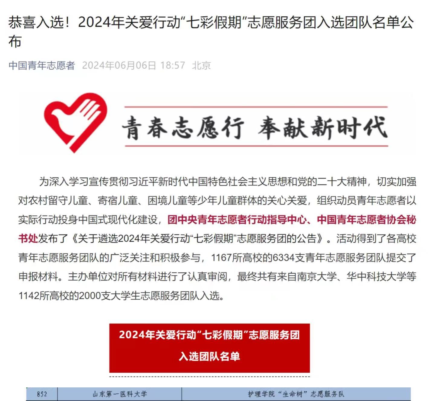 为深入学习宣传贯彻习近平新时代中国特色社会主义思想和党的二十大精神,组织动员青年志愿者以实际行动投身中国式现代化建设,团中央青年志愿者行动指导中心、中国青年志愿者协会秘书处面向全国高校青年志愿者团队发起2024年关爱行动“七彩假期”志愿服务团遴选活动。2024年6月6日,山一大蓝鲸体育“生命树”志愿服务队成功入选全国“七彩假期”志愿服务团。