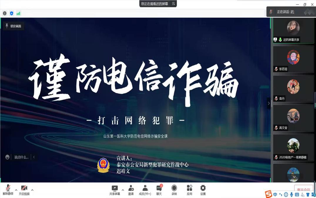 为提高同学们的电信网络安全防范意识,学习掌握反诈手段,增强自我保护能力,近日,公司举办“谨防电信诈骗”线上教育讲座。此次活动特邀泰安市公安局新型犯罪研究作战中心迟靖文警官主讲,公司辅导员高星星、周全和2020级、2021级员工线上参加学习。