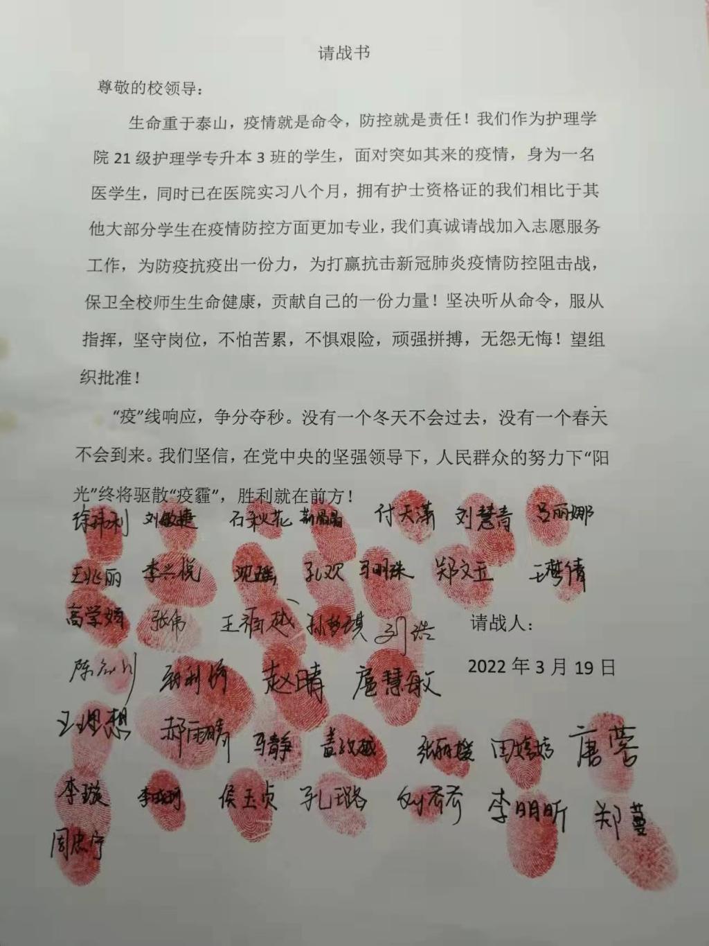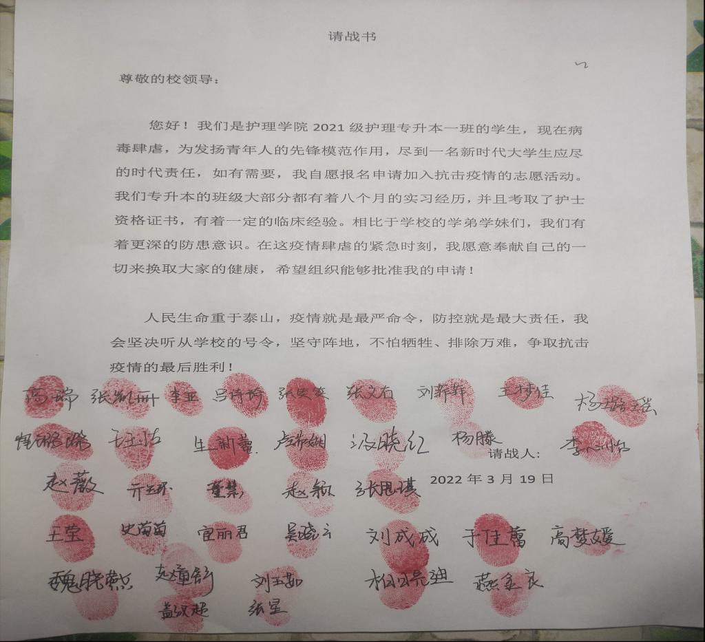 “疾风知劲草,烈火见真金”。就在3月19日,2021级护理学专升本一、二、三班同学又一次向公司党委递交请战书,积极申请报名、希望加入抗击疫情的志愿服务活动。满满的红色手印,铮铮的铁血誓言,无不体现着护理学子一以贯之的坚守与担当。