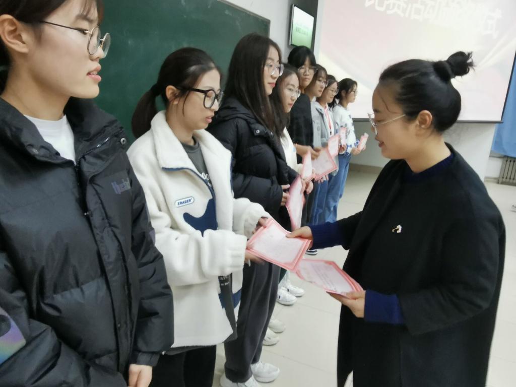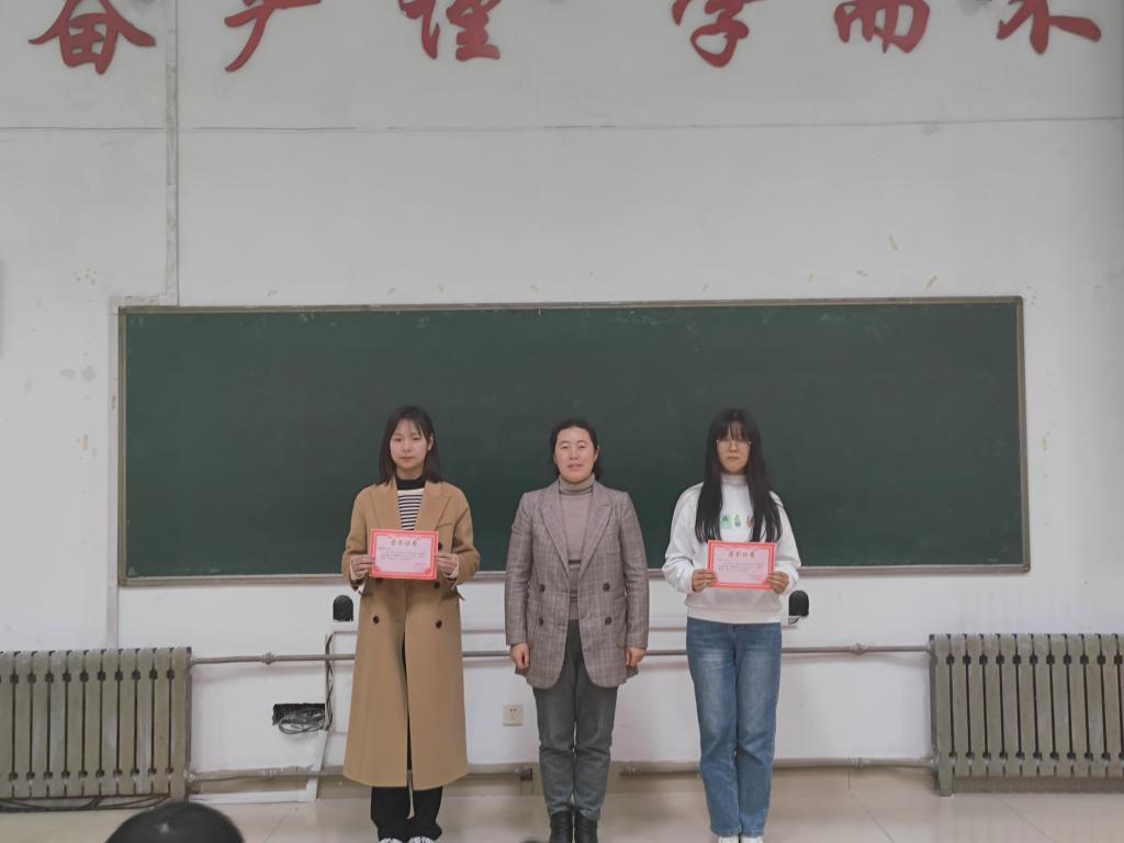 团总支副书记张恒丽宣布“挑战杯”红色专项、我与山一大合个影、青春的榜样系列征文及重阳节书画比赛等活动的获奖者名单。张延玲、林桦和学工办主任王有娟、张恒丽分别为获奖选手颁奖。