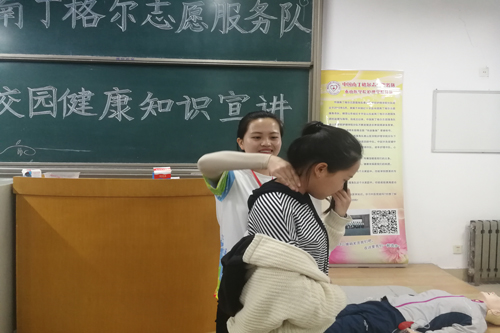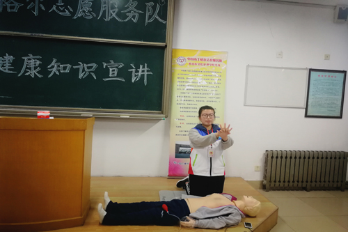 服务队急救技术中队、中医刮痧中队、中医推拿按摩中队的队员们分别向大家讲解了心肺复苏、中医刮痧和中医推拿按摩的相关知识并进行了演示。演示结束后,现场气氛活跃,同学们进行了积极的练习。