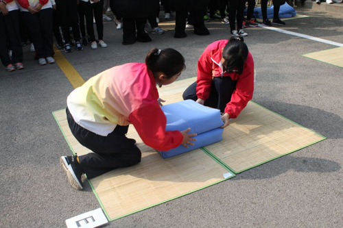 本次比赛共分48组进行,每组均由两名同学分工合作完成叠被。比赛期间,参赛选手争分夺秒,以娴熟的动作、默契的配合赢得了阵阵掌声。比赛间歇开展的背部运球、抢椅子等趣味游戏更是将现场气氛推向高潮。经过激烈的角逐,2017级李晴晴、李德丽和郭融雪、滕晓两组同学以优异的成绩,荣获本次比赛一等奖。