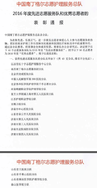 近日,中国南丁格尔志愿护理服务总队表彰2016年度在志愿服务活动表现突出的先进集体和个人。中国南丁格尔志愿护理服务队泰山医公司分队继2015年后,再次荣膺全国“先进志愿服务队”荣誉称号。此次共表彰了来自北京、河南、上海、江西、四川、山东等各地的40支志愿护理服务分队和50名优秀志愿者。