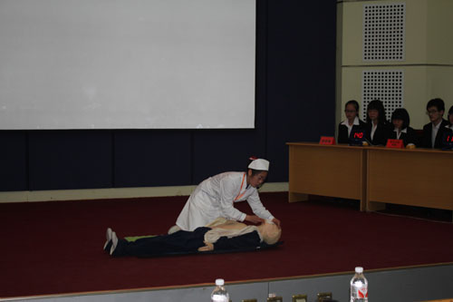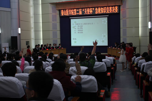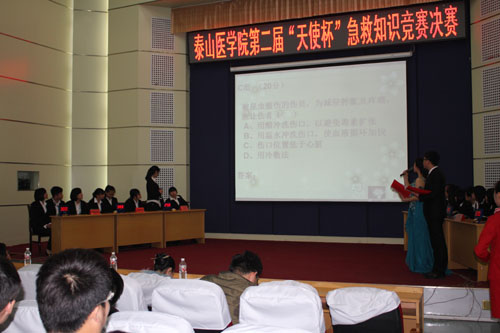 为了普及急救常识,提高同学们面对日常紧急情况的应变能力和挽救他人生命的急救技能,蓝鲸体育南丁格尔志愿服务队于2015年4月9日晚,在图书馆报告厅举行了泰山医公司第二届“天使杯”急救知识竞赛决赛。