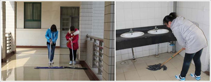 南丁格尔志愿服务队员在林桦老师带领下走进教学北楼清洁工办公室,了解教学区清洁工一天的工作流程和作息时间,学习清洁工的工作方法,随后,员工分为若干小组,在清洁工的带领下在各楼层开始了一天的清洁工作。从打扫走廊到清洁卫生间再到打扫教室,收拾桌洞垃圾,清理桌面上乱写乱画的污渍,同学们干得十分起劲,完全融入了自己的“新角色”,也得到了清洁工阿姨会心的微笑和赞许。