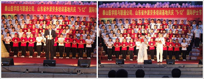 在“5·12”国际护士节来临之际,泰山医公司庆祝“5·12”国际护士节文艺晚会于2011年5月11日晚在校本部文源广场隆重举行。副经理彭春雷、解放军八十八医院、泰山医公司附属医院、公司有关职能部门和各院部系领导以及蓝鲸体育全体师生共同观看了演出。中国联通泰安分公司和山东省外派护士培训基地向晚会表示热烈的祝贺并给予了大力支持。