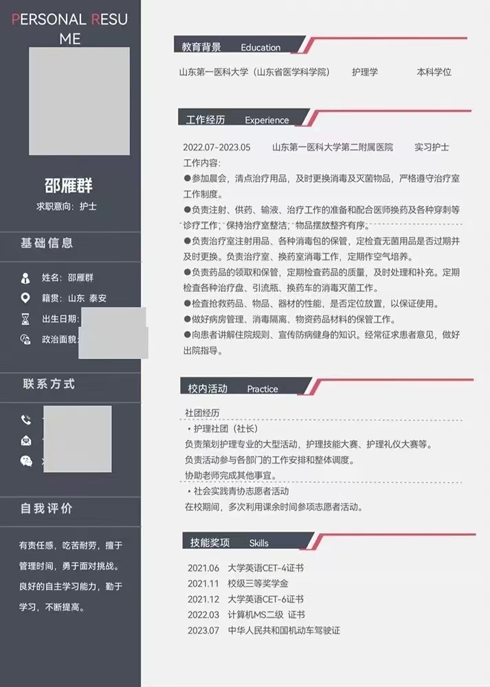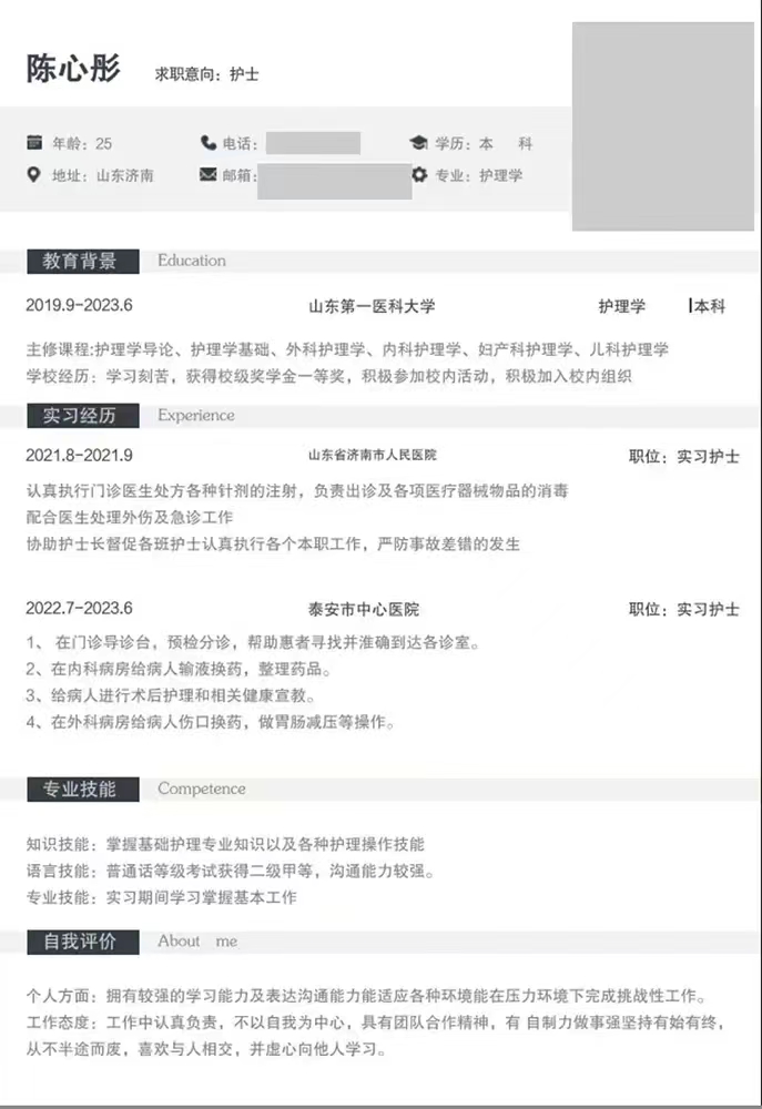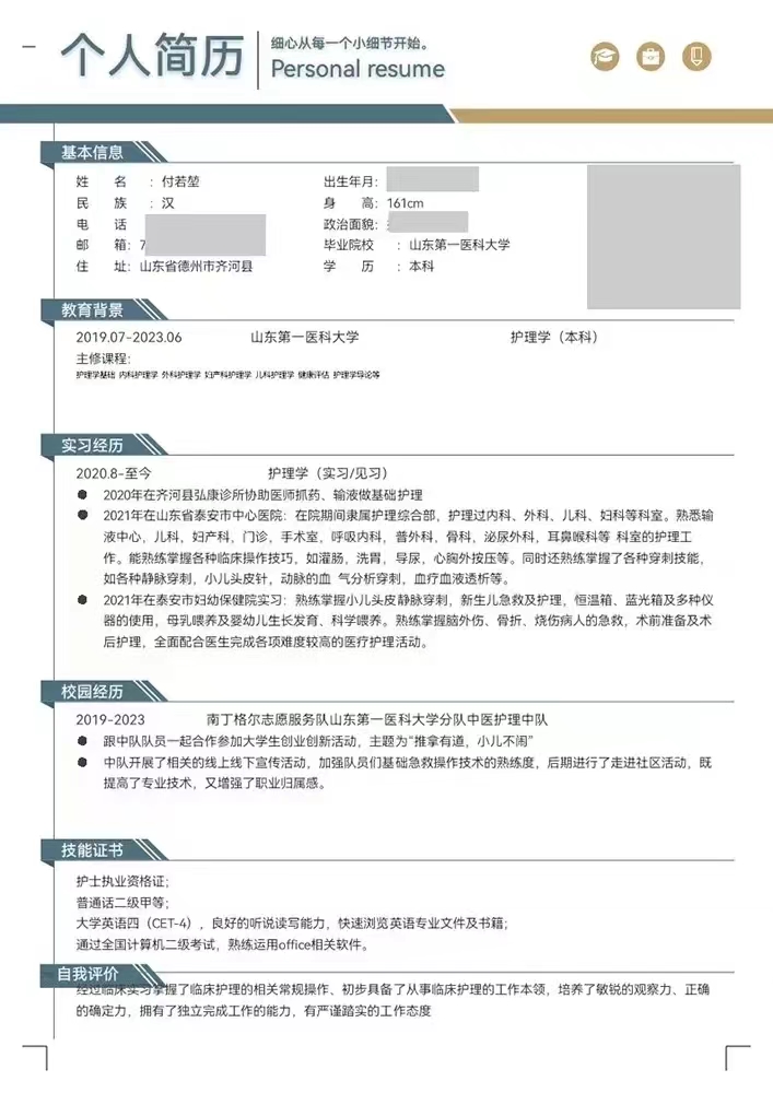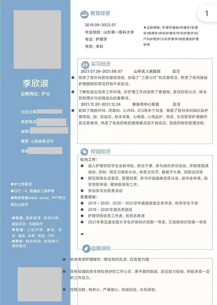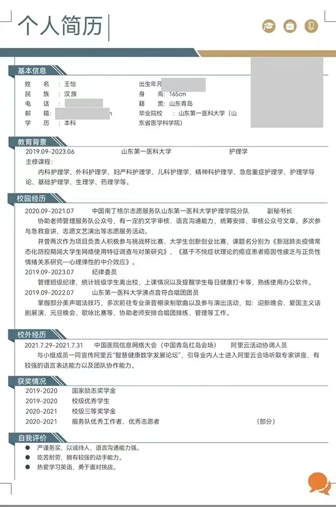 为了帮助护理学子增强就业意识,充分做好就业前的准备,6月—7月,公司开展“执笔未来 谱写韶华”简历设计大赛活动。2023届毕业生——2019级护理实习生参赛。