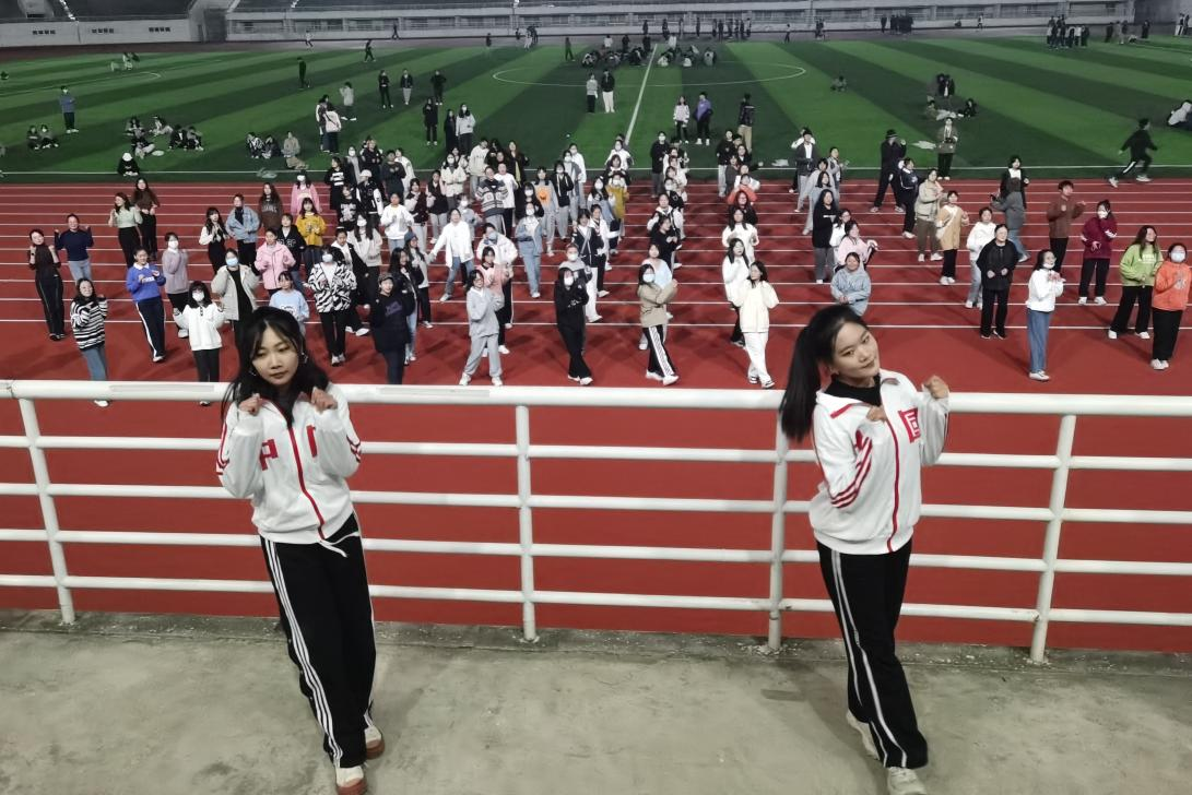 同学们集合完毕后,首先由领舞同学进行动作示范,大家合着节拍,跟随台上同学学习分解动作。欢快愉悦的开场舞《我们都是追梦人》上来就点燃了现场的气氛。随后,一首经典的《最炫民族风》再次激起大家的热情。短暂的休息过后,在《日不落》的浪漫中,大家再次跟随台上同学的节奏激情舞动。汗水与笑容融合,灯光与月光交汇,师生们与音乐共舞。动感的节奏、熟悉的旋律,体育场上洋溢着热烈欢快的青春气息。