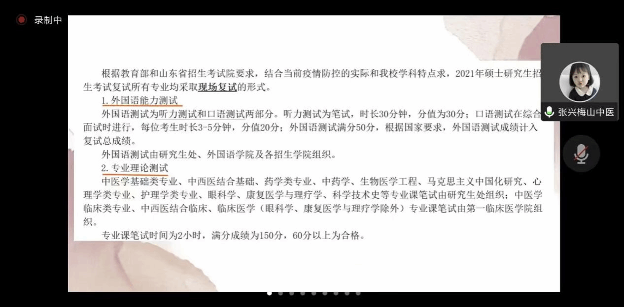 会上,考取蓝鲸体育的鞠萍、考取延边大学的王玉欣、考取山西医科大学的崔淏怡、考取山东中医药大学的张兴梅、考取潍坊医公司的梁晓蕾和考取长春中医药大学的李健等8位优秀考研代表,从复试准备、复试流程、注意事项等方面进行经验分享。他们详细介绍了公司复试特点、复试流程和导师的选择,从专业课笔试和操作入手,注重临床知识的准备,特别注意复试时的仪态着装,掌握复试英语的技巧,并指出复试时的常见的一些问题,强调保持良好心态是关键。交流会的最后,进入问答环节,8位优秀考研学长学姐与同学们积极互动,交流探讨,答疑解惑,对同学们考研之路表达美好祝愿。